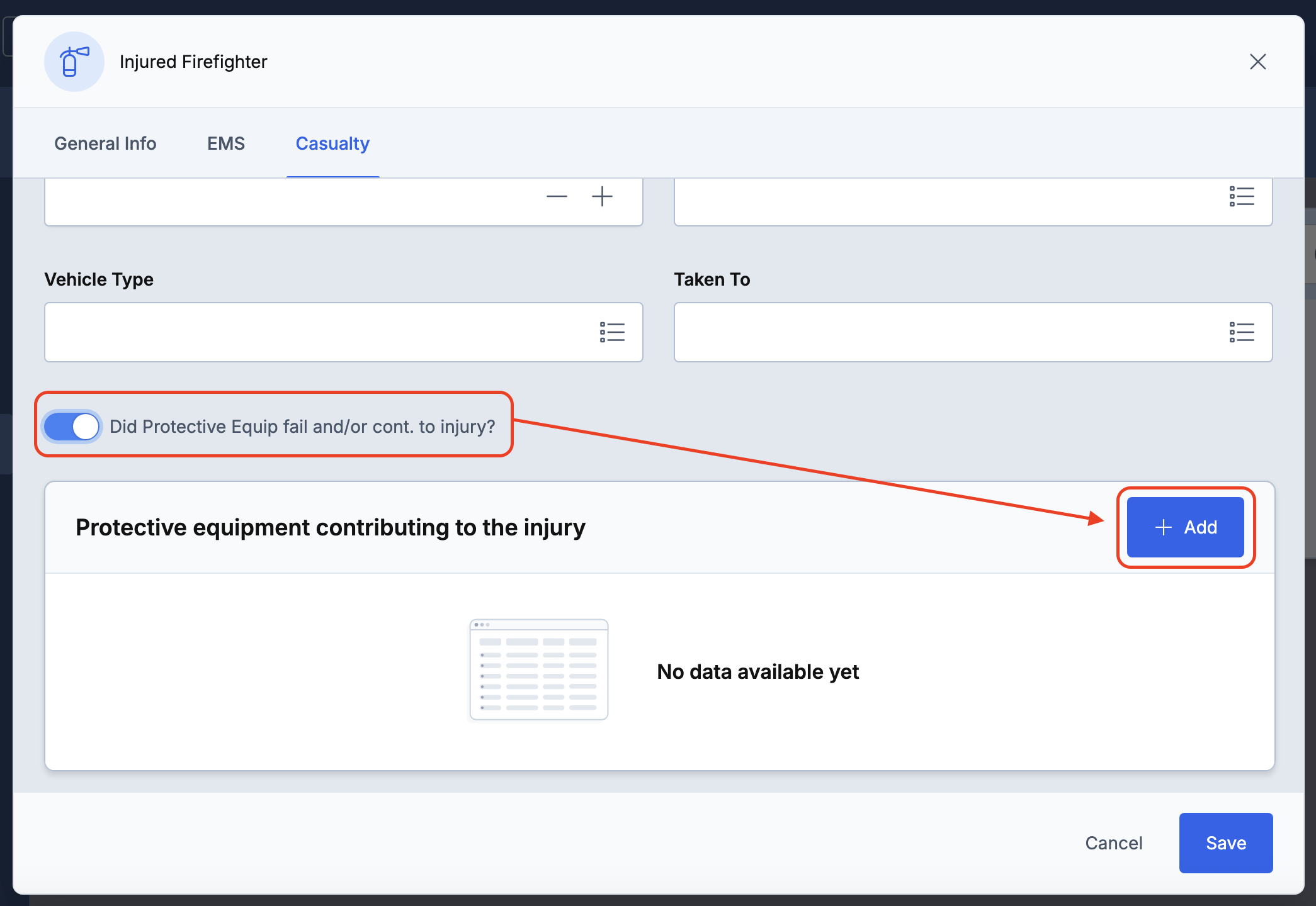 If the firefighter's Personal Protective Equipment (PPE) failed or contributed to the injury at the time of the casualty, select "Yes" for the question "Did Protective Equip fail and/or cont. to injury?" to document equipment details.