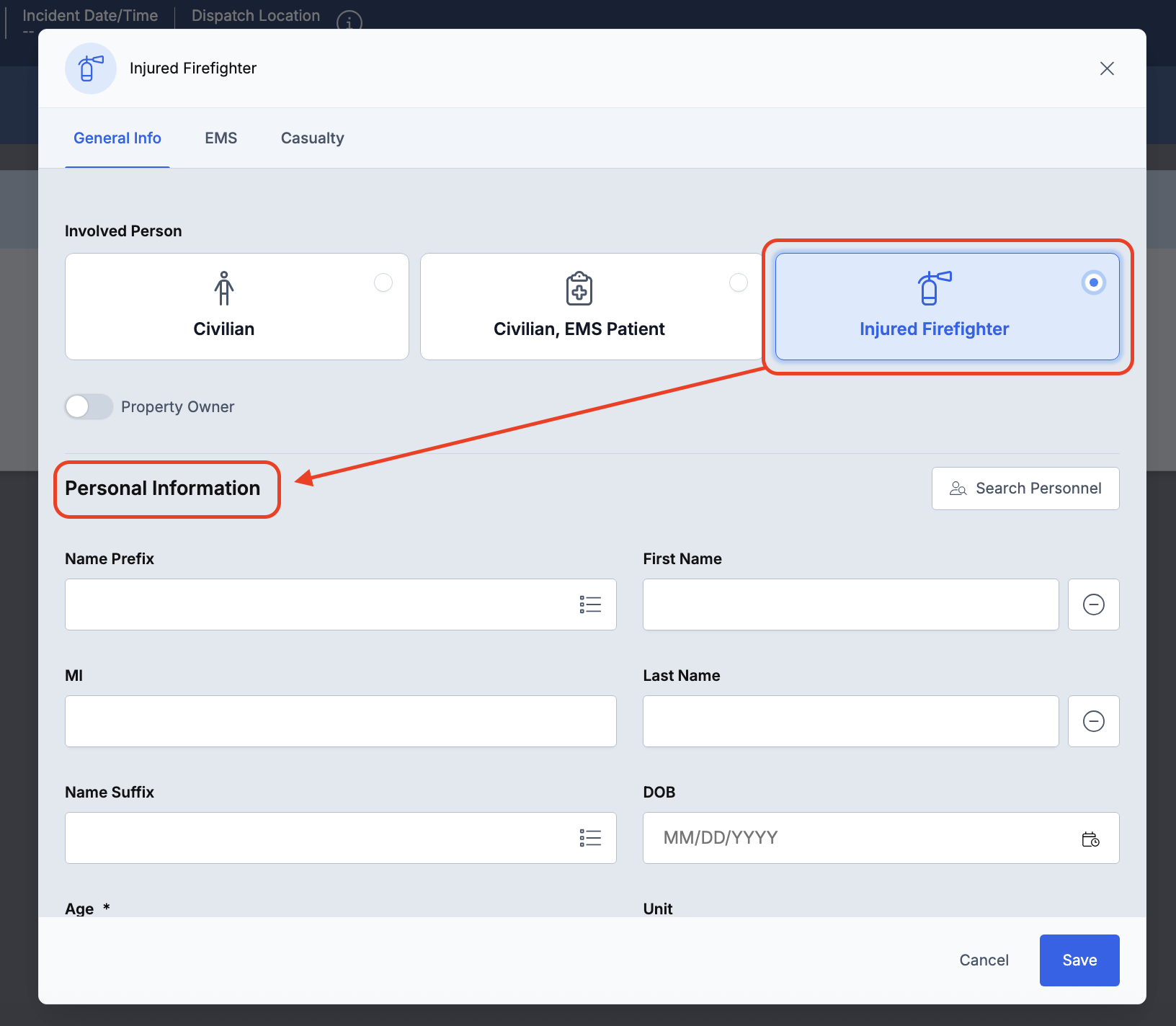 Select the Injured Firefighter toggle to designate this person as a firefighter casualty.