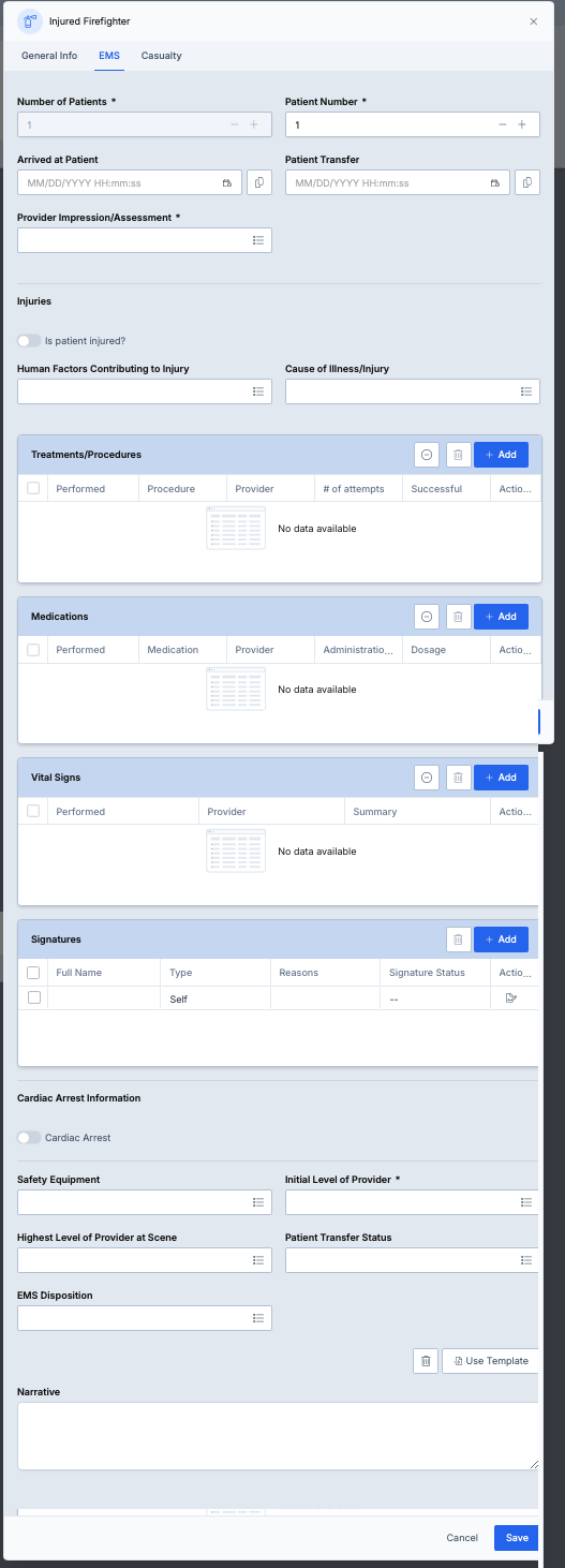 Fill out the EMS section with patient care information. Complete all required fields marked with an asterisk (*), including Number of Patients, Patient Number, Provider Impression/Assessment, and Initial Level of Provider. Add treatments, procedures, medications, vital signs, and signatures as applicable by clicking the corresponding "Add" buttons. Document any cardiac arrest information, safety equipment used, and patient transfer details. Include a narrative description of the incident and patient care provided.