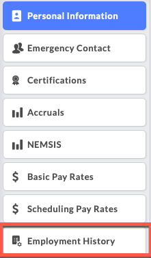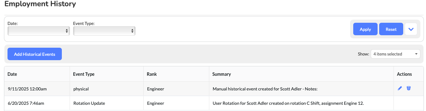 The Employment History section provides a comprehensive tracking system for personnel career progression, assignment changes, and significant employment events within your department. This feature enables supervisors and administrators to maintain detailed records of each employee's professional journey, including automatic tracking of shift assignments and rotations, as well as manual entry of important career milestones and historical events.