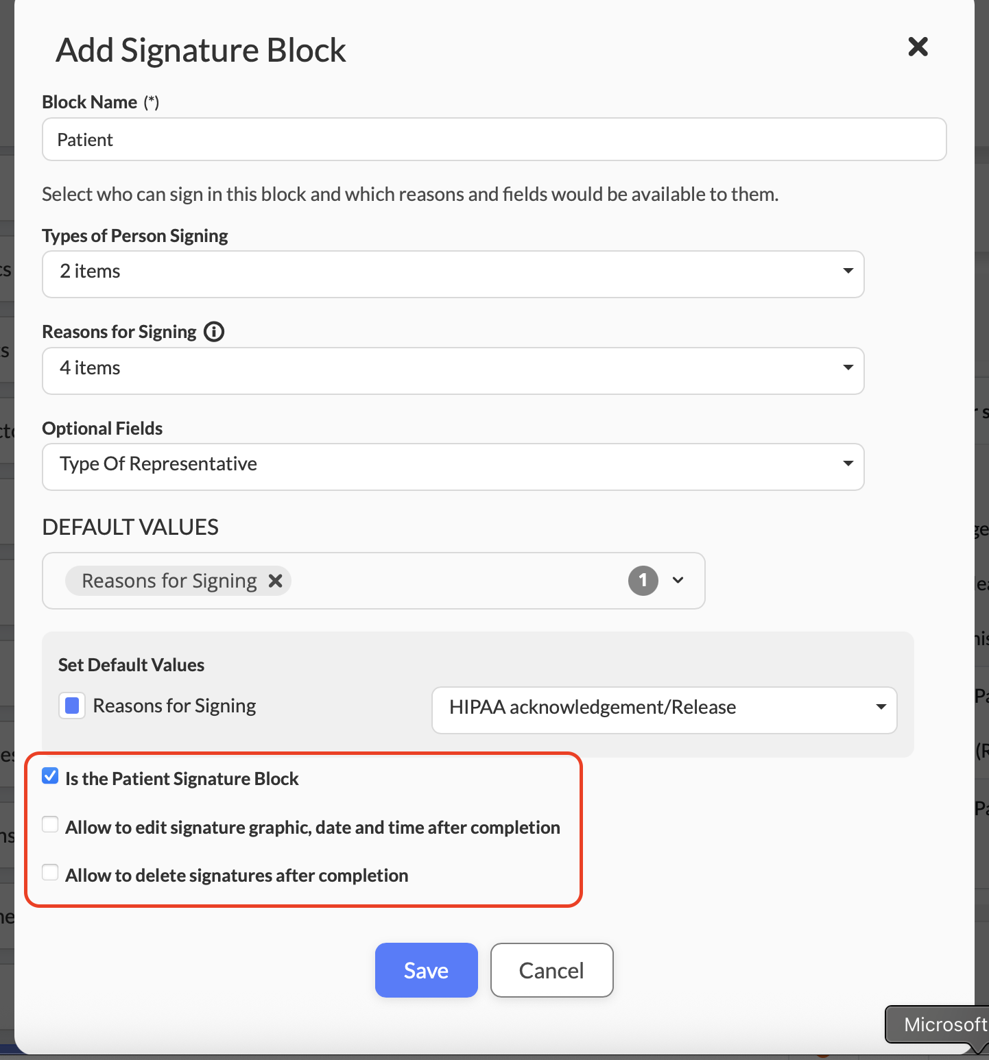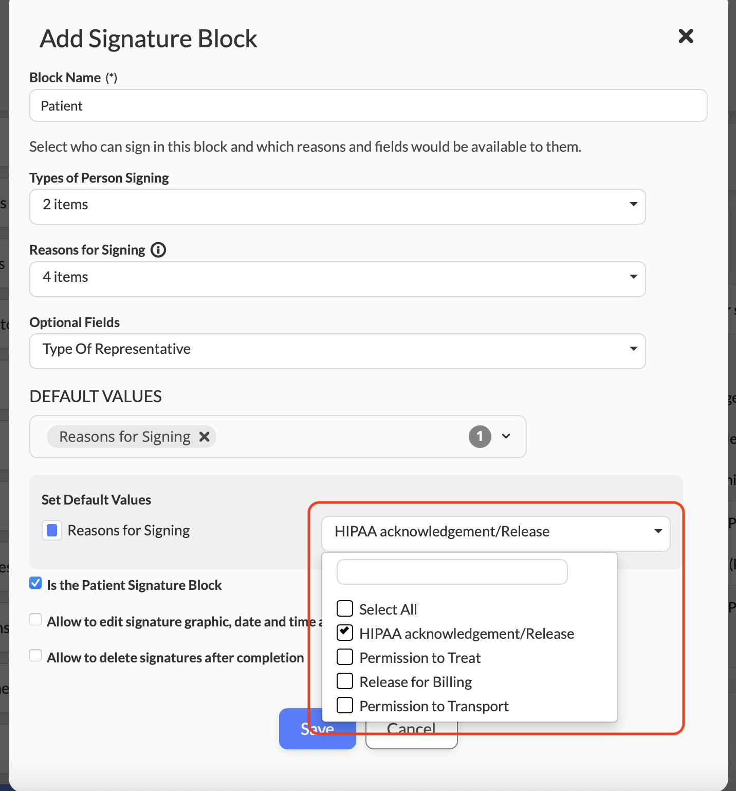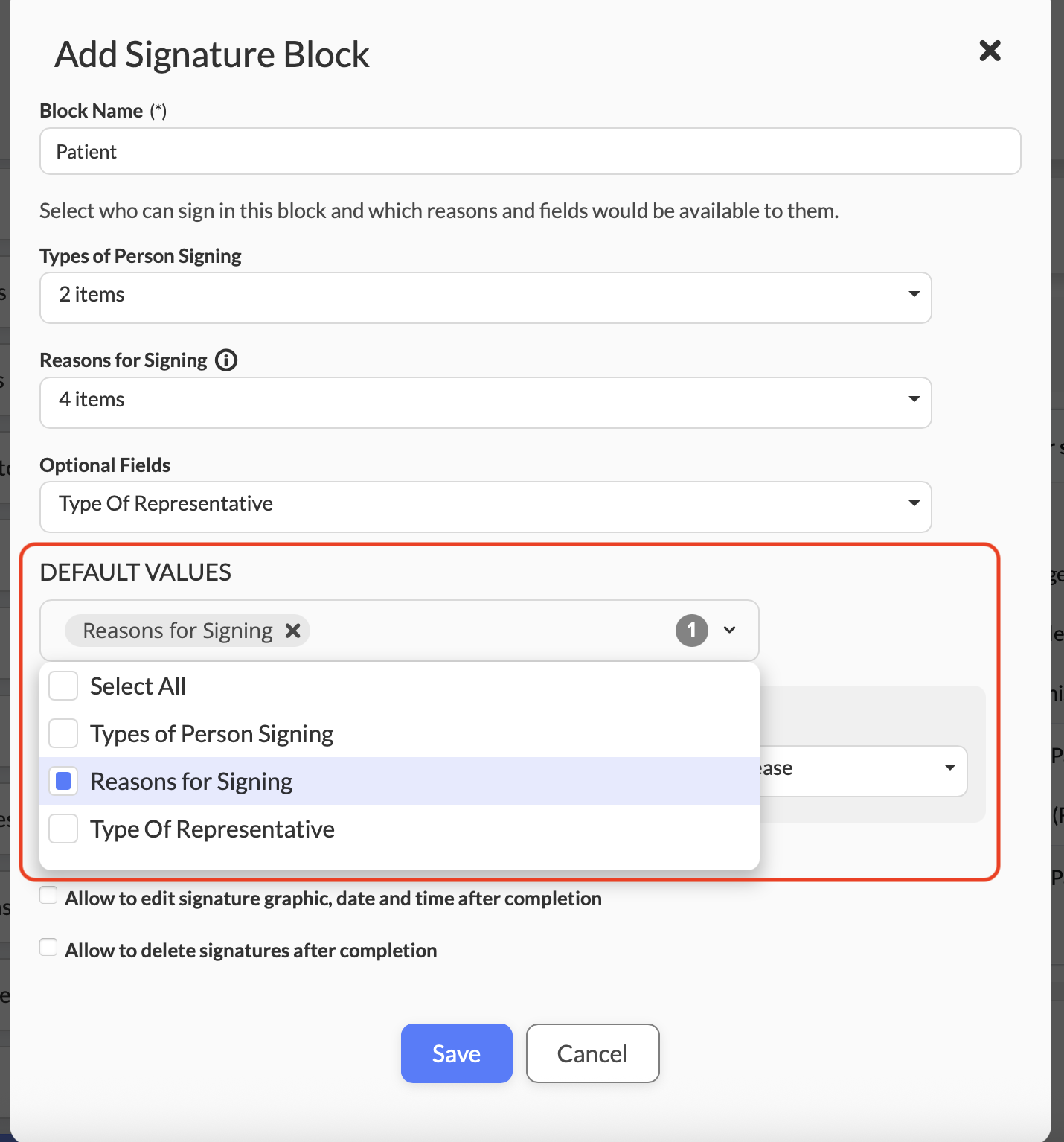 Remember that Form Language items must be created for each Reason for Signing to appear in signature blocks (see related Form Language setup article)