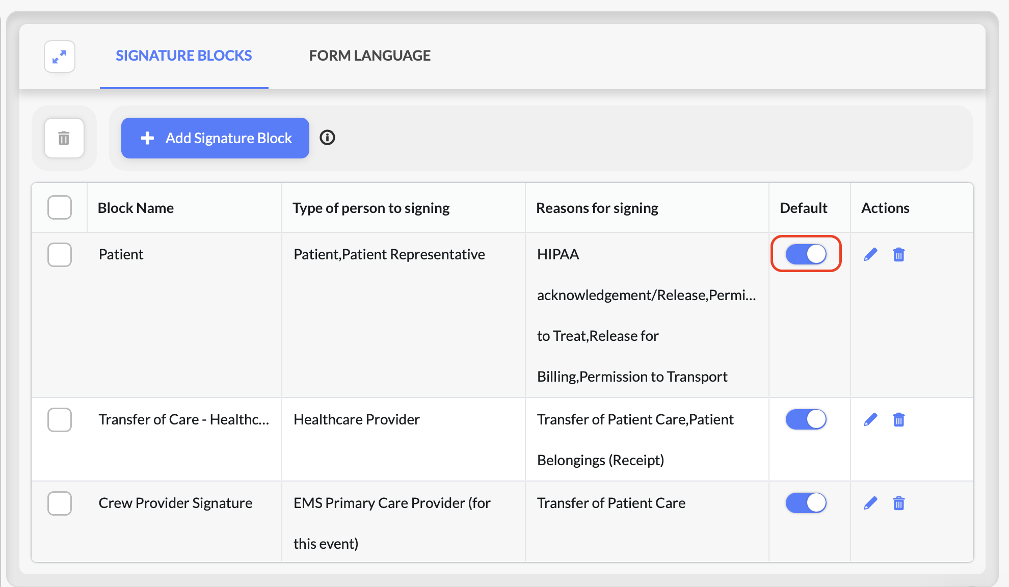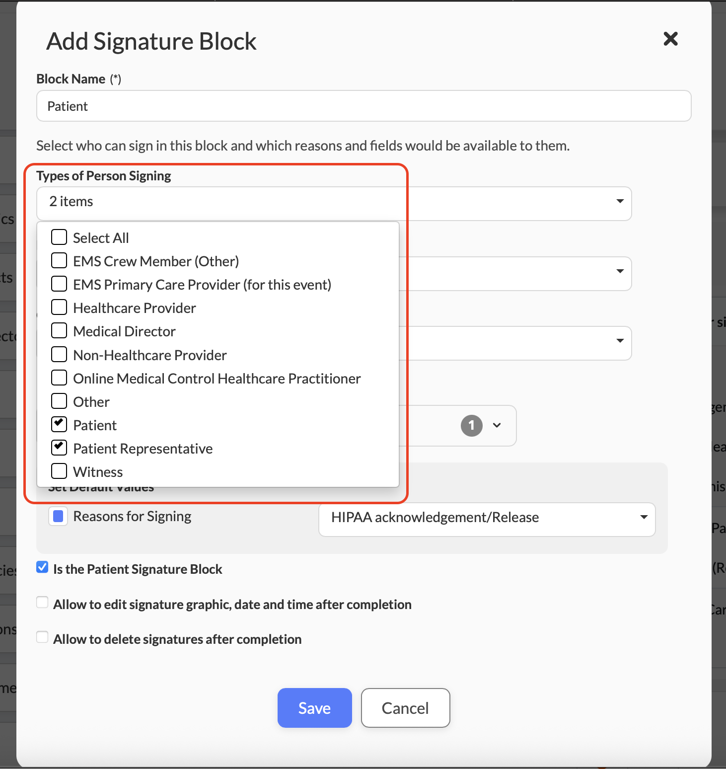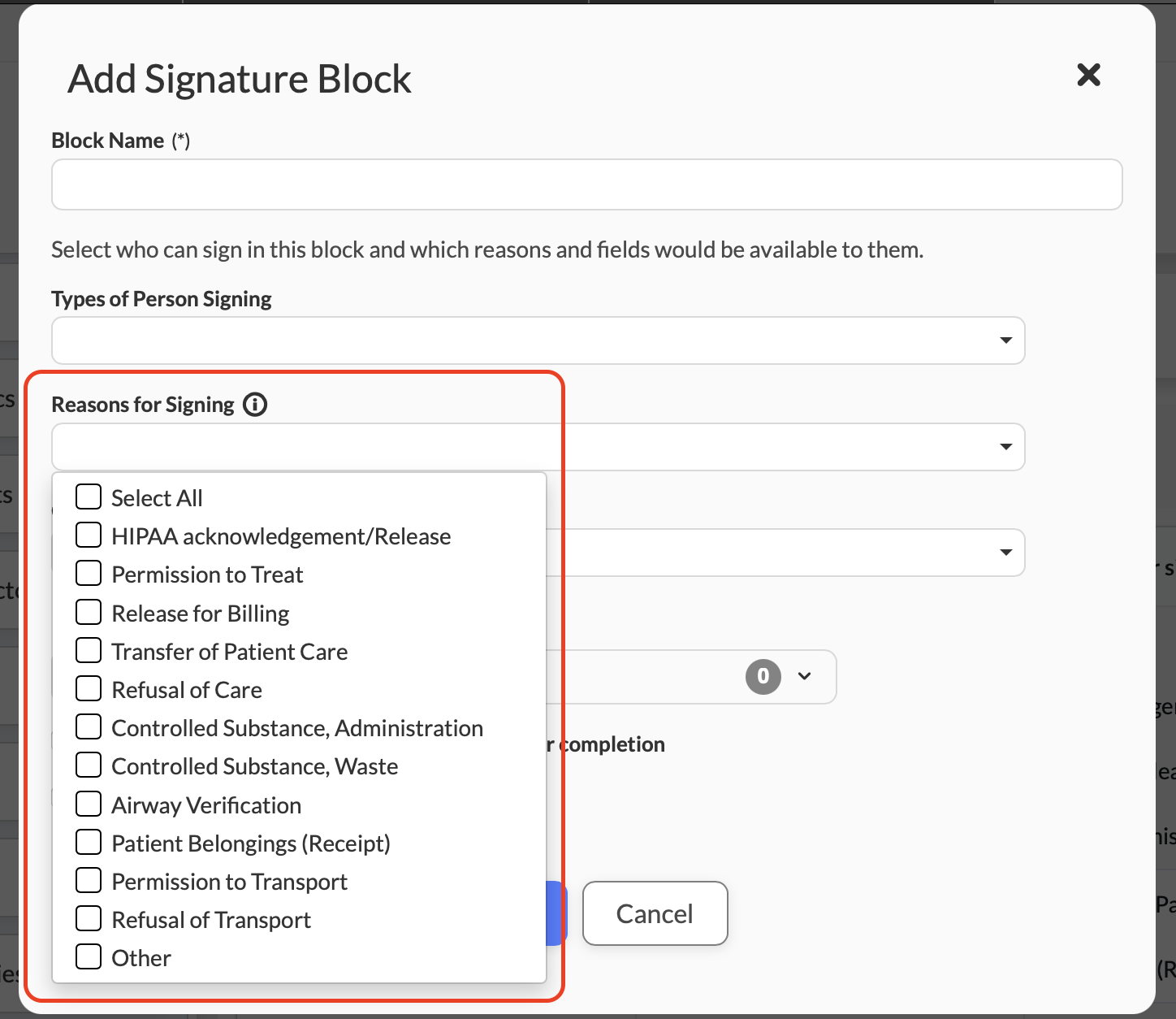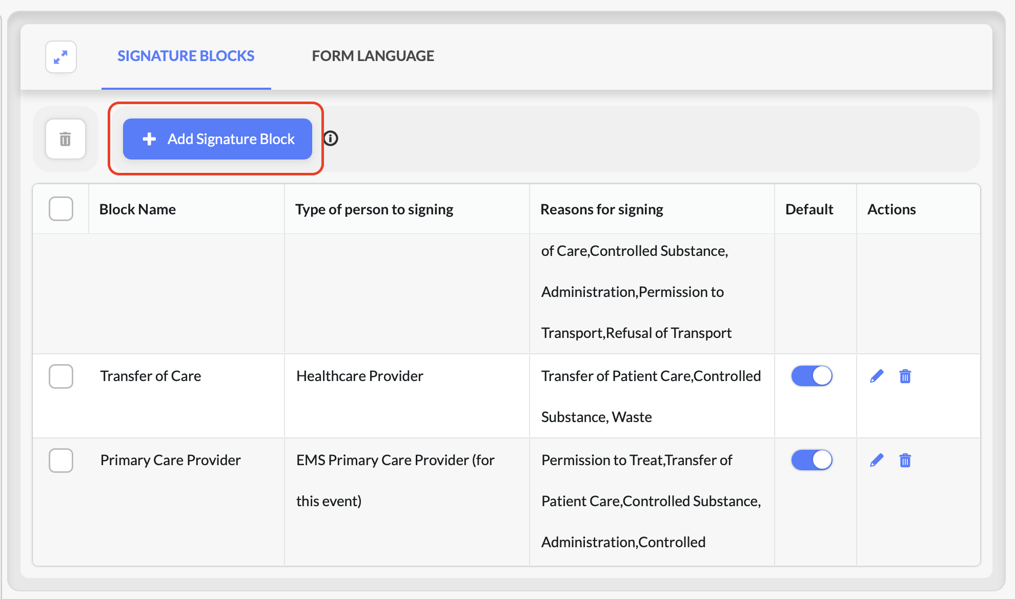 What is a Signature Block? A signature block represents a dedicated position within an ePCR for a specific person (patient, crew member, nurse, etc.) to sign for a specific reason (refusal, transfer of care, medication use, etc.). Each block represents a separate signature within an ePCR.
