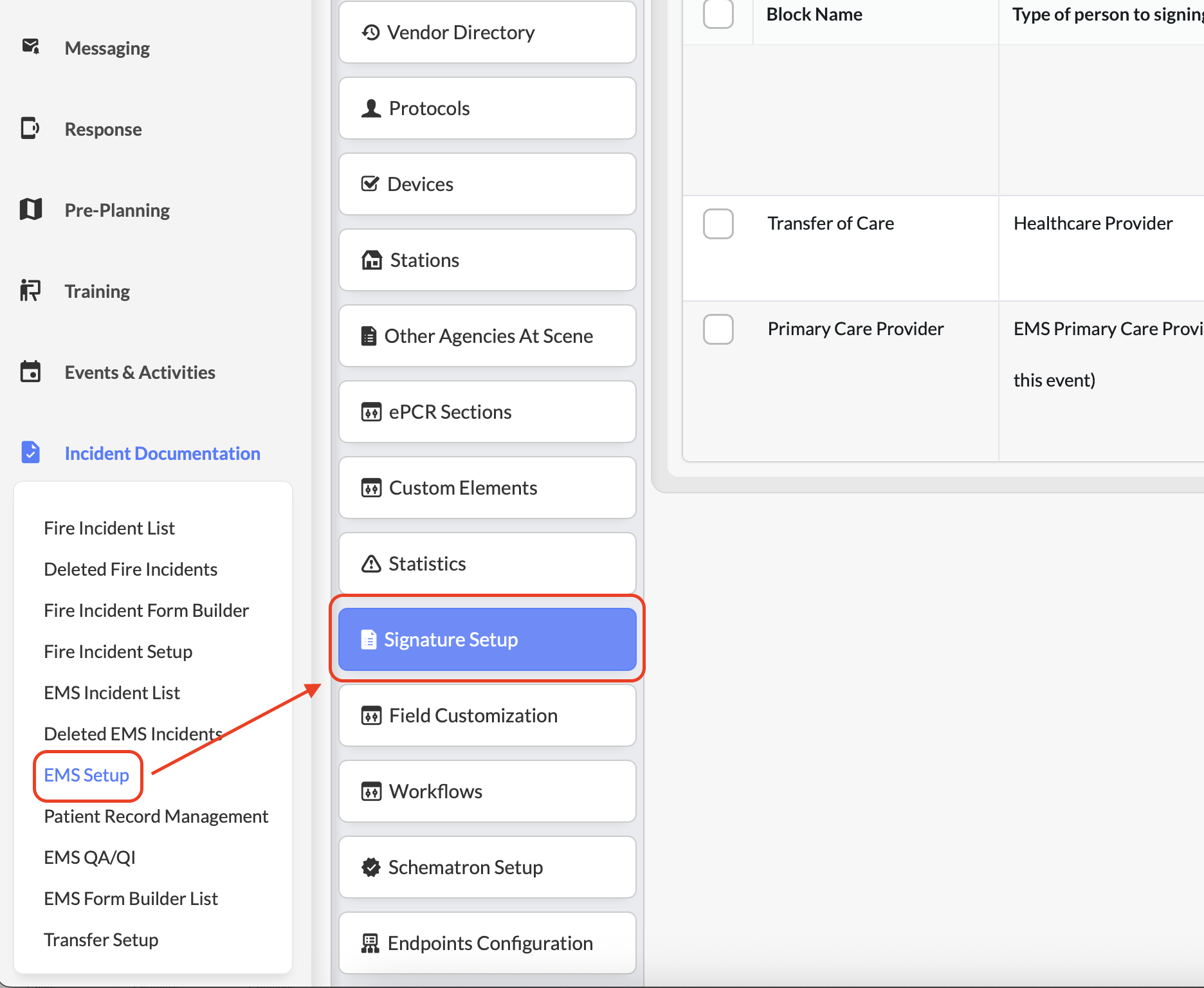 Purpose To explain how to set up Signature Language within the Fire Incident EMS module. Video Directions 1. Navigate to Fire Incident Setup via the Incident Documentation Module. 2. Click on EMS Module. 3. Look for Signatures Language. Signatures ...