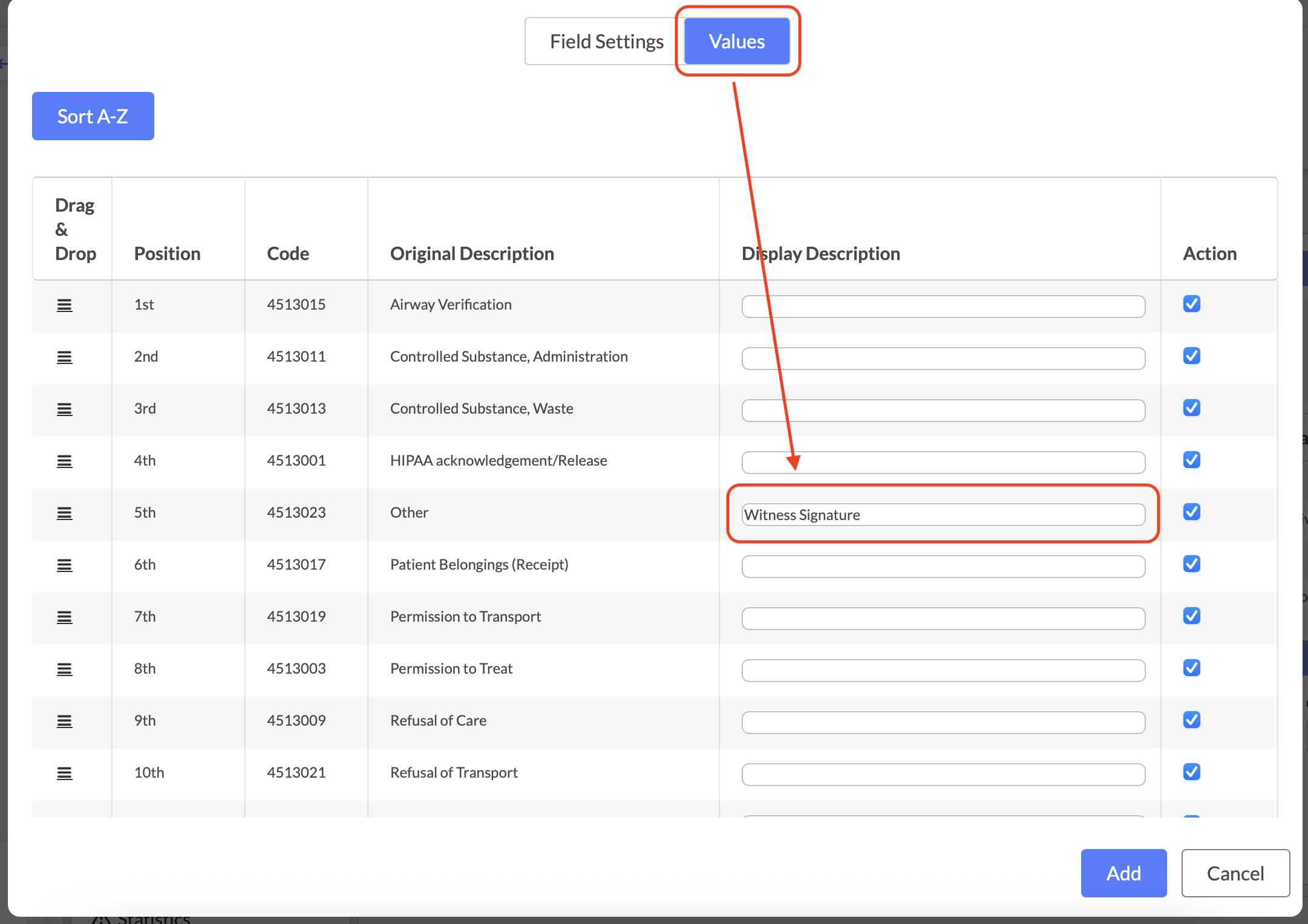 A: Use EMS Setup -> Field Customization to edit the display names for "Reasons for Signature" to match your department's preferred terminology.