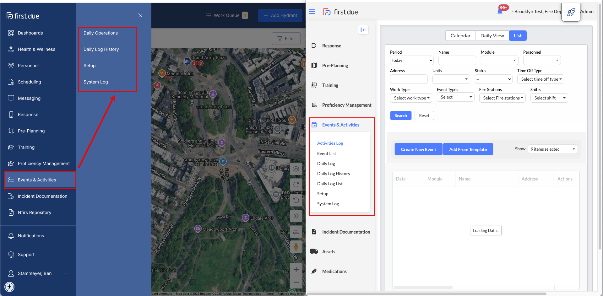 You will see a unified list containing Events, Daily Log entries, and Activities. The Calendar, Daily View and List areas of the Daily Operations section mirror those of the Activities Log in the old menu setup