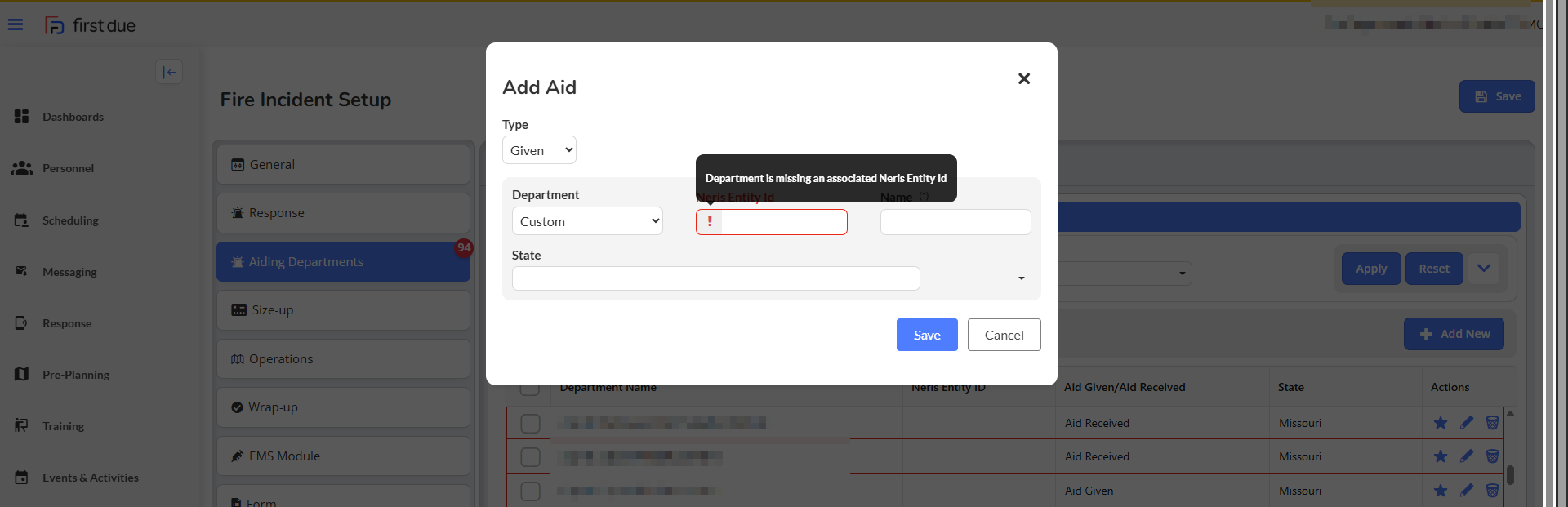 Why - This enhancement was implemented due to customer request to prevent incomplete data transmission to NFIRS and NERIS that negatively impacts reporting accuracy, departmental metrics, and potential grant funding eligibility. Previously, administrators could save Aiding Department configurations without entering the required FDID or Entity ID values, resulting in these departments being excluded from state reporting submissions or appearing with incomplete identification information. This issue was particularly problematic when customers transitioned from NFIRS to NERIS reporting, as existing aiding departments configured with FDID values would lack the newly required NERIS Entity IDs, and these gaps went unnoticed without system-level validation. The lack of visibility into missing identifiers meant that mutual aid responses could be under-reported or incorrectly attributed, potentially affecting grant applications that rely on accurate mutual aid activity documentation and compromising the completeness of regional response data shared with state reporting systems.