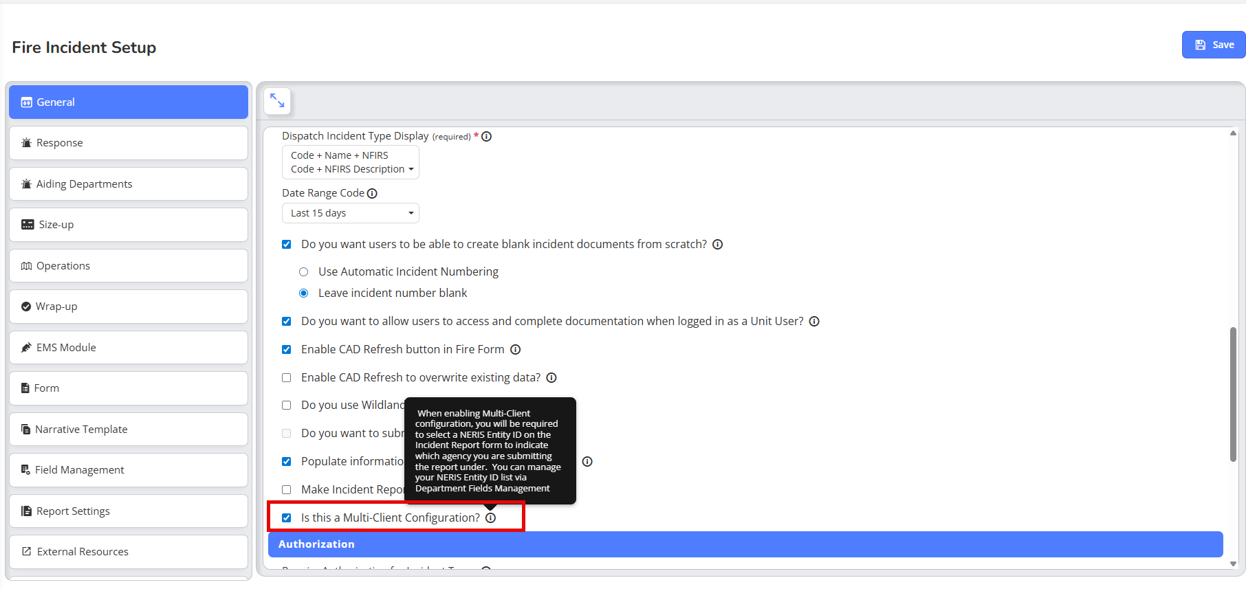 Use Case - A county fire department manages three separate volunteer fire districts, each requiring independent NERIS reporting under distinct Entity IDs: FD12345678 for District 1, FD87654321 for District 2, and FD11223344 for District 3. The department administrator enables Multi-Client Configuration and adds all three Entity IDs to the system, which automatically registers each district's stations and apparatus under their respective Entity IDs. When District 2 responds to a structure fire, the incident report creator selects Entity ID FD87654321 from the NERIS Entity ID dropdown in the Dispatch section, ensuring that when the incident is exported to the state, it appears under District 2's identity with the correct station and apparatus associations. The department can view read-only NERIS-returned identifiers for each district's resources on the Department edit page, and all registration activities are tracked in the export logs for audit purposes. If a new station is added to District 1, the system automatically registers it under all three Entity IDs to maintain consistency across the multi-client configuration.