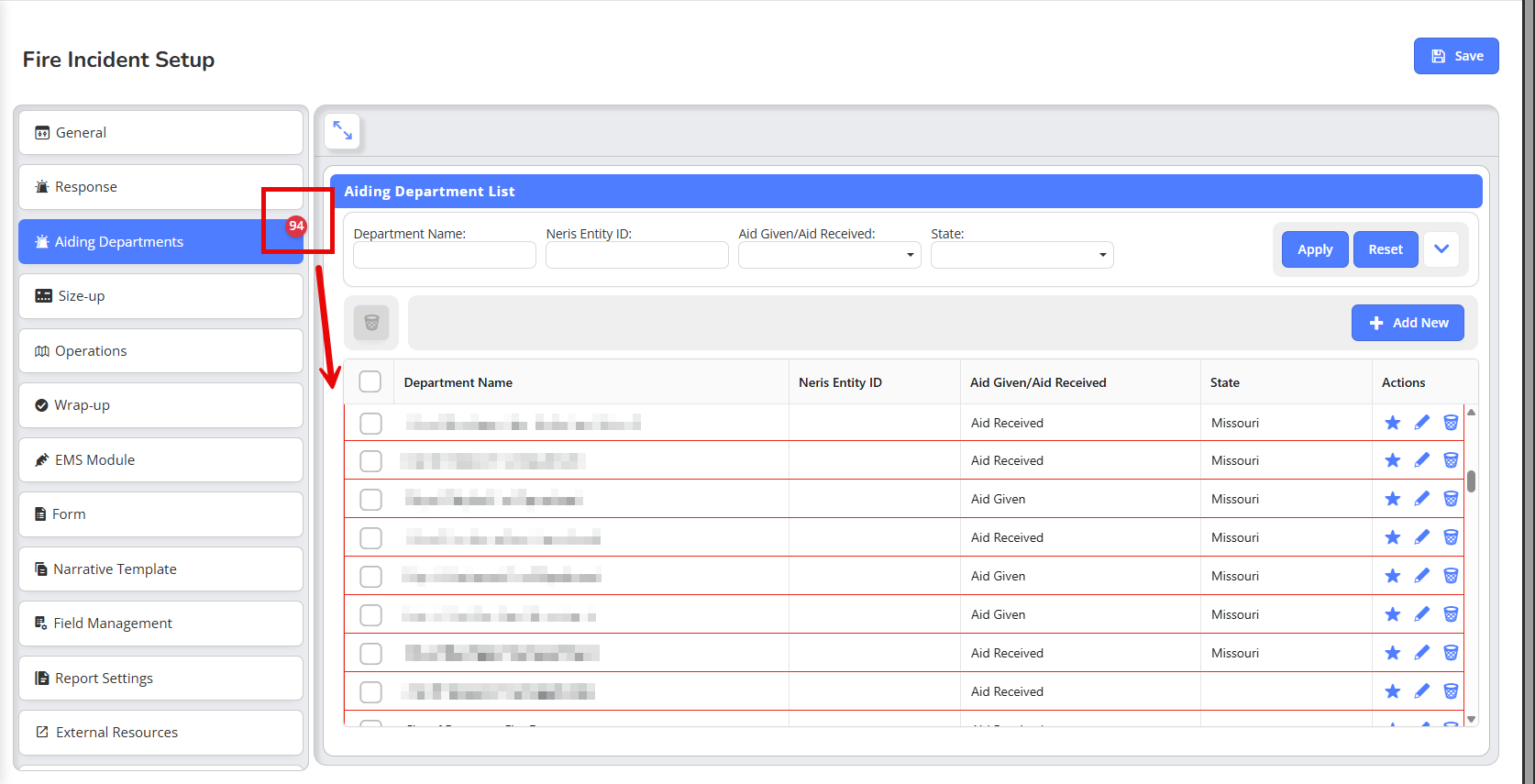 Note: When transitioning from NFIRS to NERIS, existing Aiding Departments are retained but will be flagged if missing NERIS Entity IDs until corrected