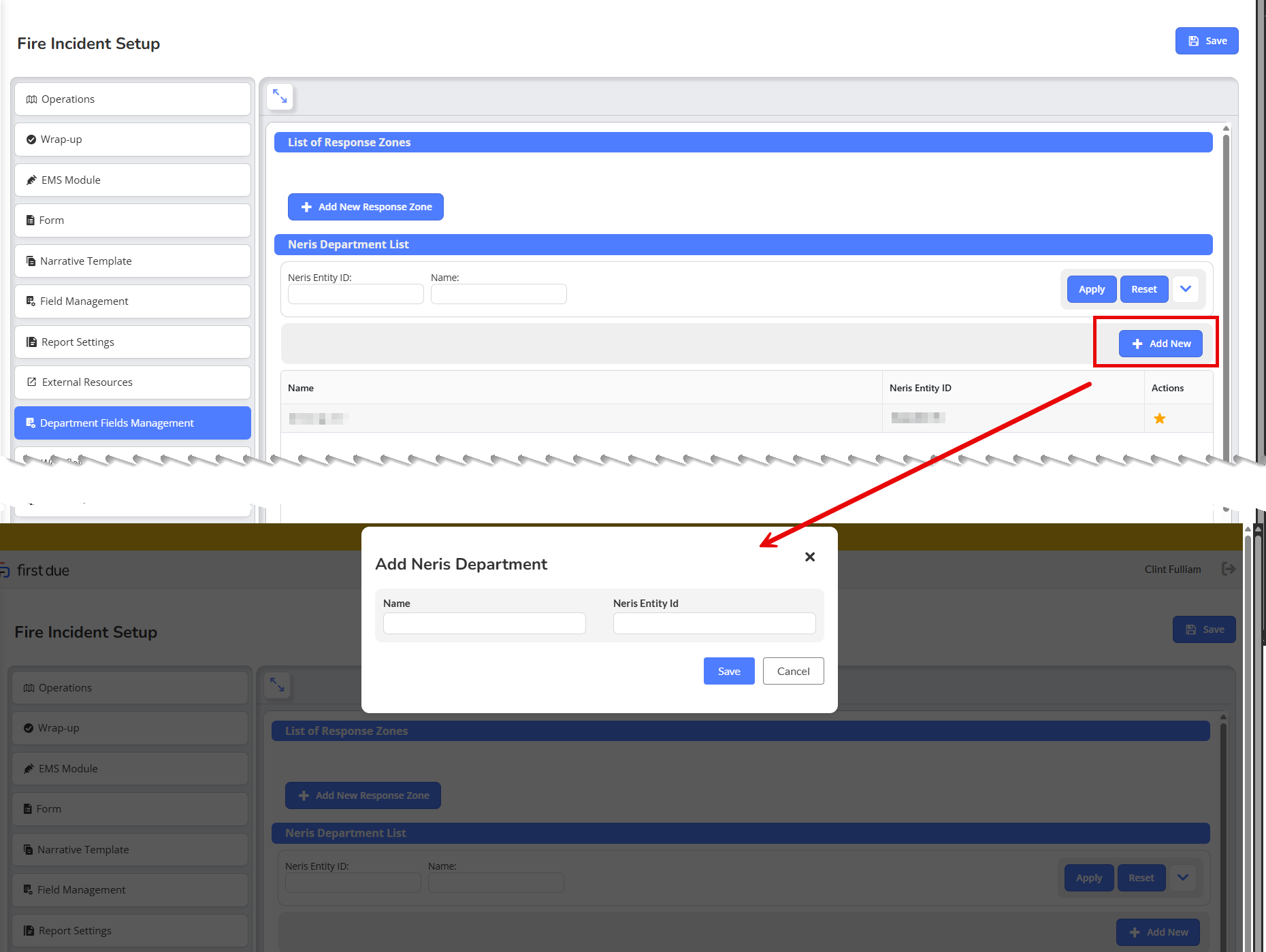 Access Fire Incident Setup → Department Fields Management → NERIS Entity IDs to add additional Entity IDs