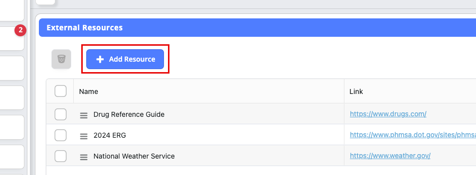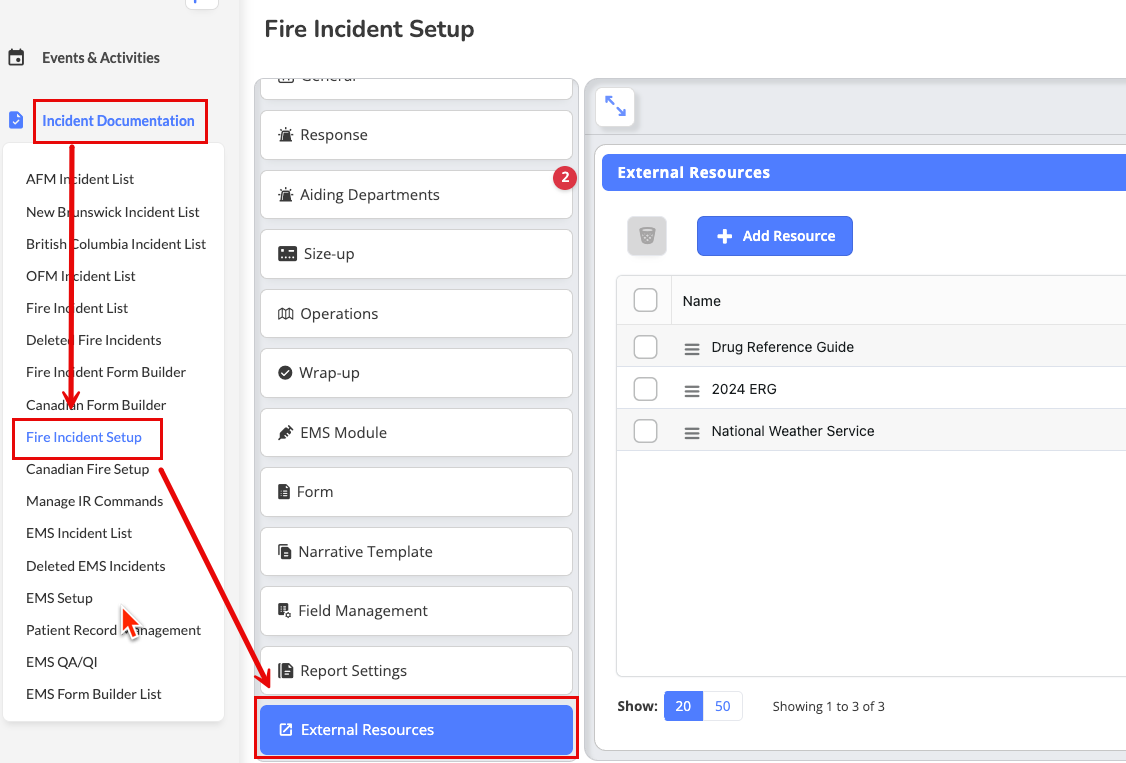 Q: Can I reorder the external resources in the list? A: Check your Fire Incident Setup interface for drag-and-drop functionality or ordering options. If not available, resources are typically displayed in the order they were created.