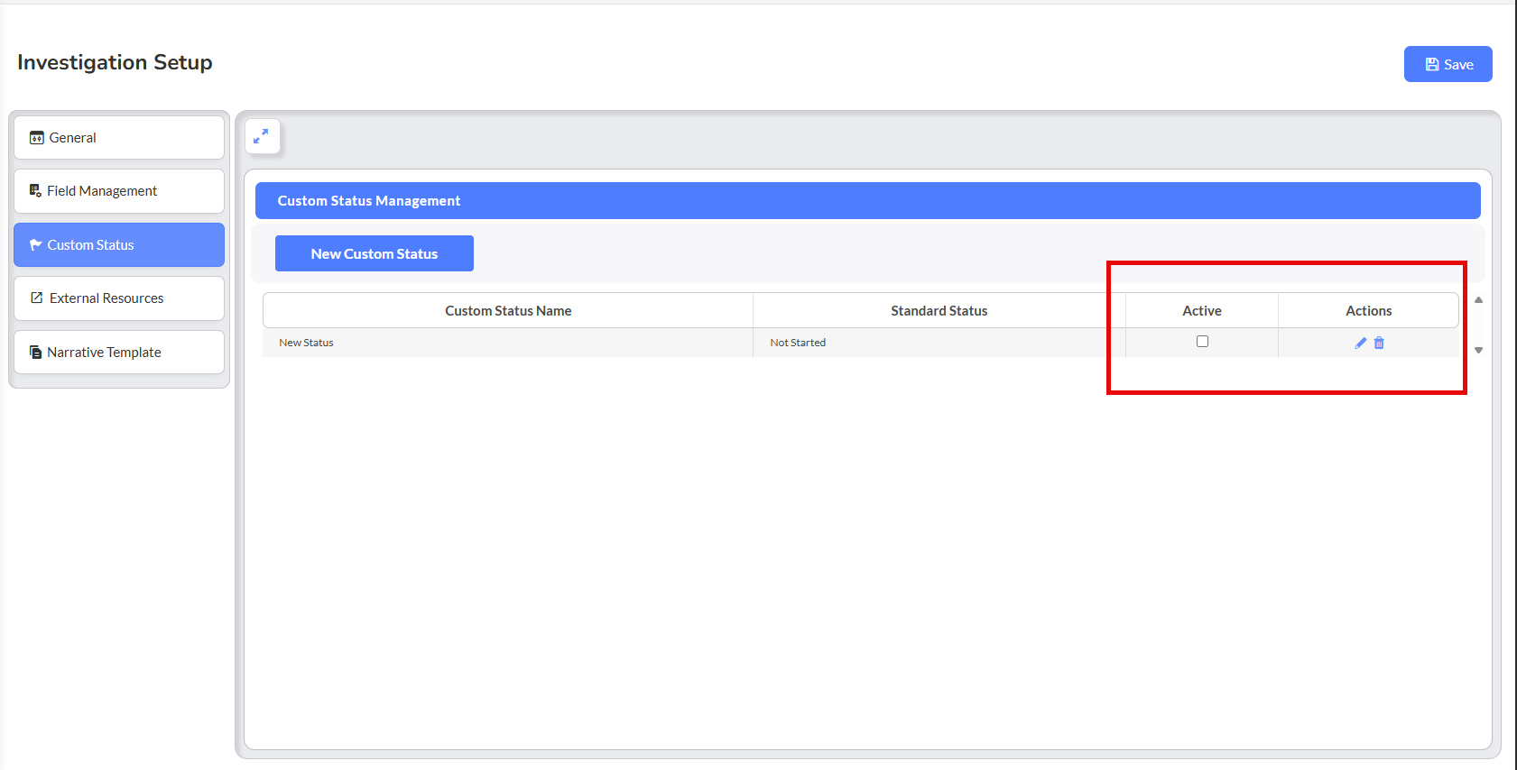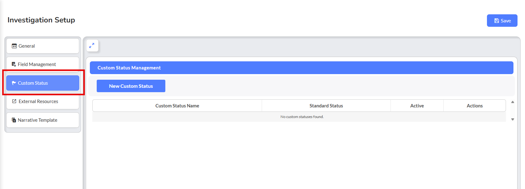 What - A new Custom Status configuration has been added under Field Management, allowing agencies to create their own investigation statuses in addition to the platform's standard lifecycle statuses (Not Started, In Progress, Pending Authorization, and Authorized). Users can define custom status names, associate them with standard statuses, and manage their active state through a dedicated interface that includes options to create, edit, activate, and delete custom statuses as needed.