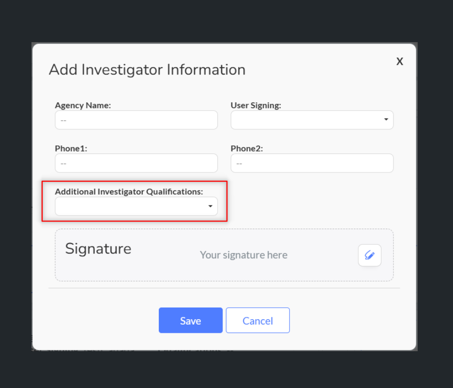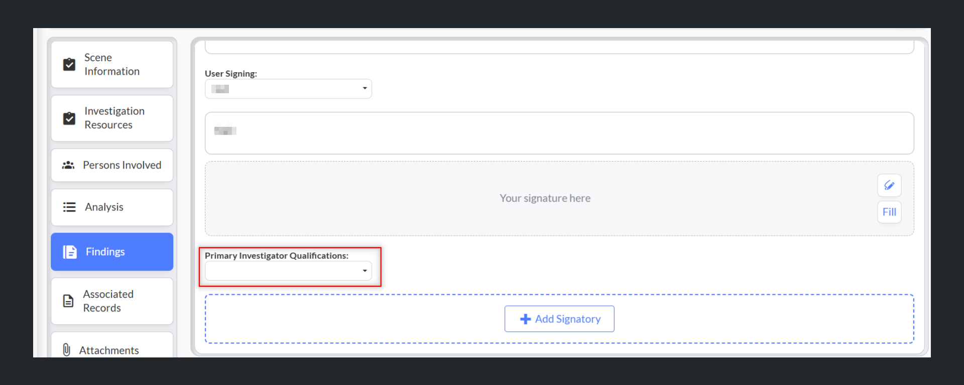 What - A new Investigator Qualifications list field has been added to the Findings tab, allowing agencies to capture qualification details for the primary investigator as well as any additional investigators added to the record (secondary, additional, etc.). The qualification values are fully customizable through Field Management, and the field appears in the User Signing Signature section for the primary investigator, within the signatory block for secondary investigators, and in the Add Investigator Information modal for additional investigators.