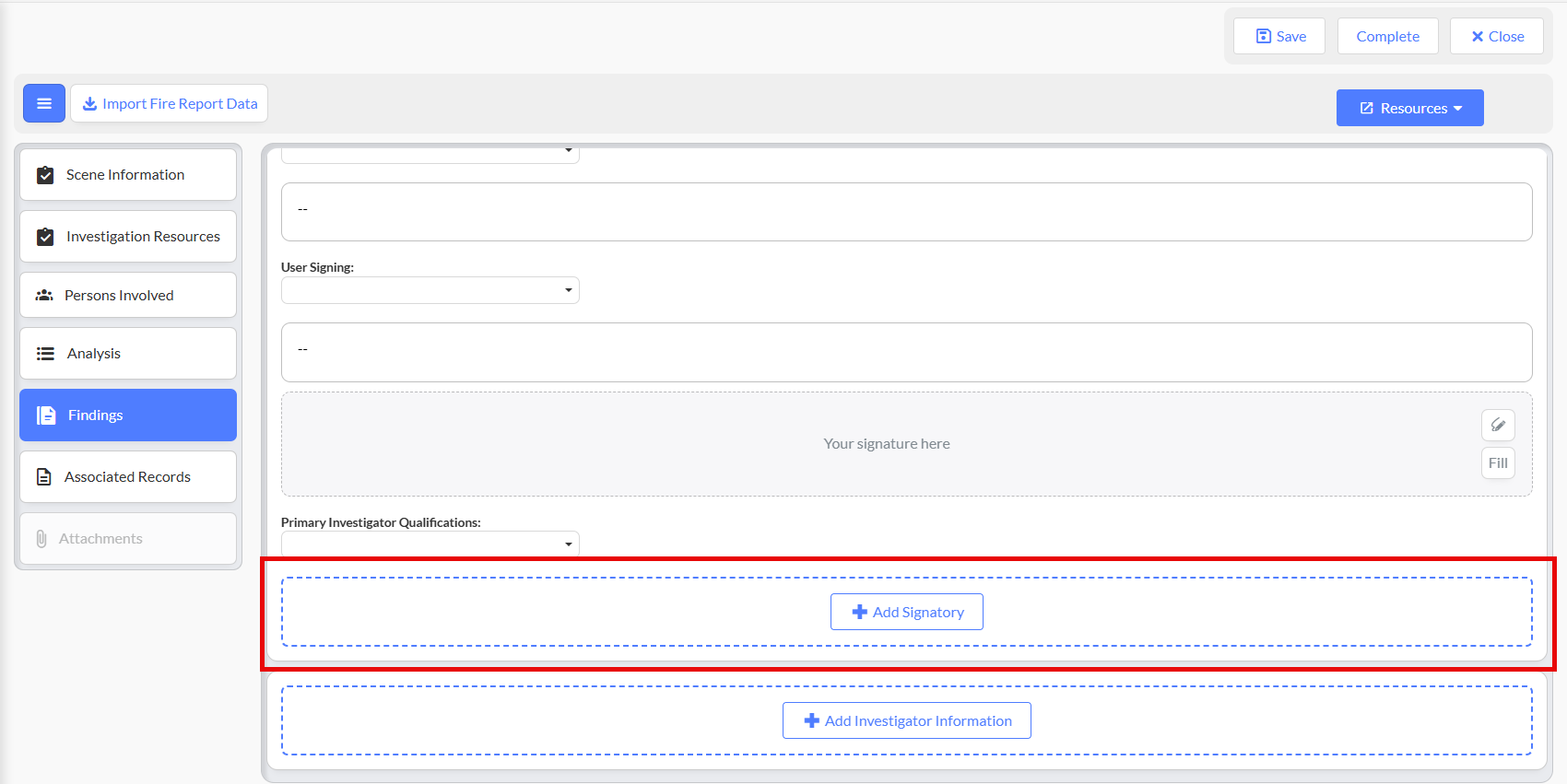 What - A new + Add Signatory component has been introduced in the Findings section, enabling users to dynamically add multiple signature blocks to Fire Investigation records. Each signature block includes the User Signing section with the user's name (autopopulated), a signature component with Fill option support, and an Investigator Qualifications field, allowing unlimited additional signatories to be added as needed with the ability to delete any non-default signature blocks.