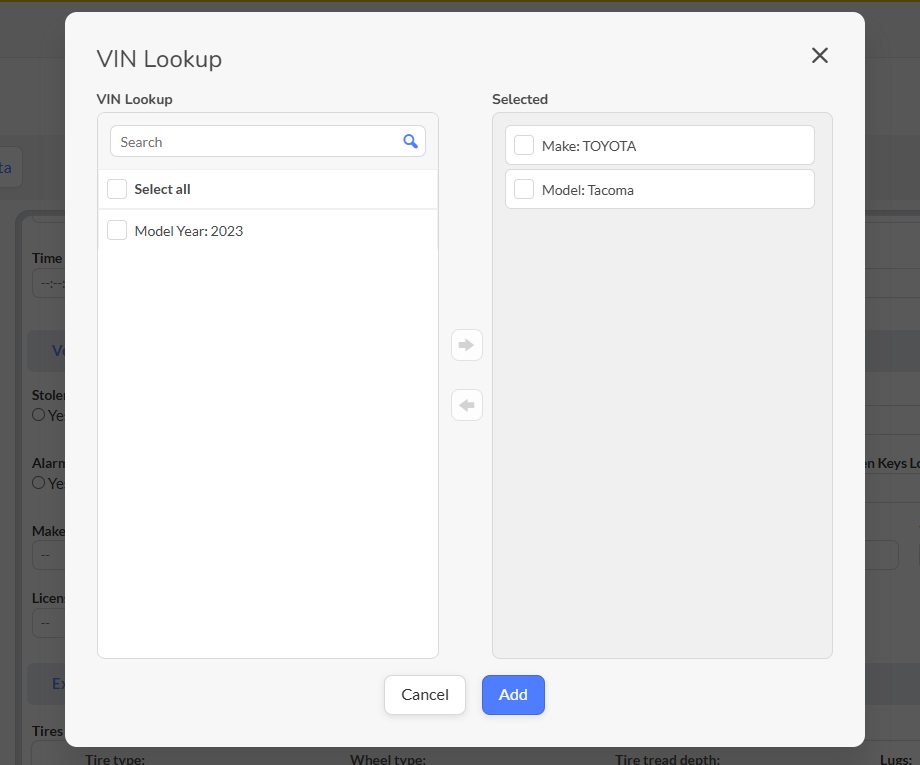 Select the desired vehicle from the list and click Add (the Add button remains disabled until a vehicle is selected)