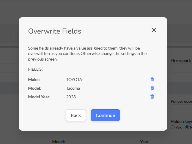 In the Overwrite Fields modal, review the fields that will be updated (Make, Model, Model Year)