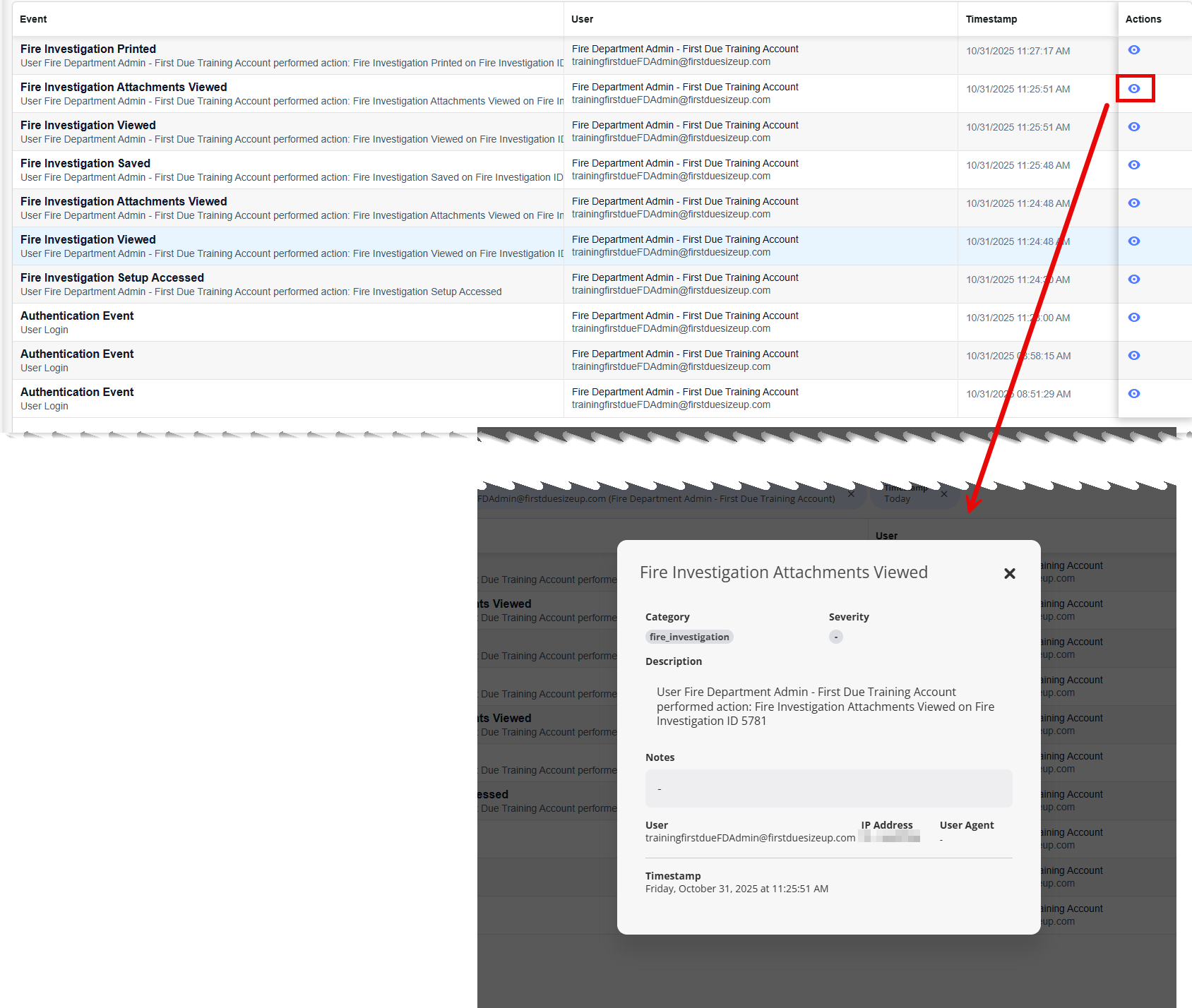 Use Case - A fire investigation unit is conducting an arson investigation where the case may proceed to criminal prosecution, requiring detailed documentation of evidence handling and report access for legal discovery purposes. Three months after the investigation was authorized, the defense attorney requests audit documentation showing who accessed the fire investigation report and when any modifications were made. The Fire Investigation supervisor navigates to the Audit Log and filters by the specific Fire Investigation ID to retrieve all logged activities for that case. The audit trail shows that the lead investigator viewed the report on the incident date, saved it twice during the initial documentation phase, printed it once for case file purposes, and that the attachments were viewed by both the lead investigator and the supervising fire marshal. The log also reveals that no modifications were made after the report was authorized, and only authorized personnel with legitimate investigative roles accessed the record. The supervisor clicks the Action (Eye) icon on each audit entry to view detailed information including exact timestamps, user credentials, and specific actions performed. Additionally, when reviewing a separate inquiry about changes to investigation form configurations, the supervisor filters the audit log by "Fire Investigation Form" actions and identifies that a custom form was updated two weeks prior, with the audit entry displaying the specific Form Builder ID that was modified and showing which administrator made the change. This comprehensive audit capability enables the fire investigation unit to provide complete accountability documentation for legal proceedings, demonstrate proper evidence handling protocols, verify that no unauthorized access or modifications occurred, satisfy discovery requirements without manual reconstruction of access history, and maintain the evidentiary integrity necessary for successful prosecution of arson cases.
