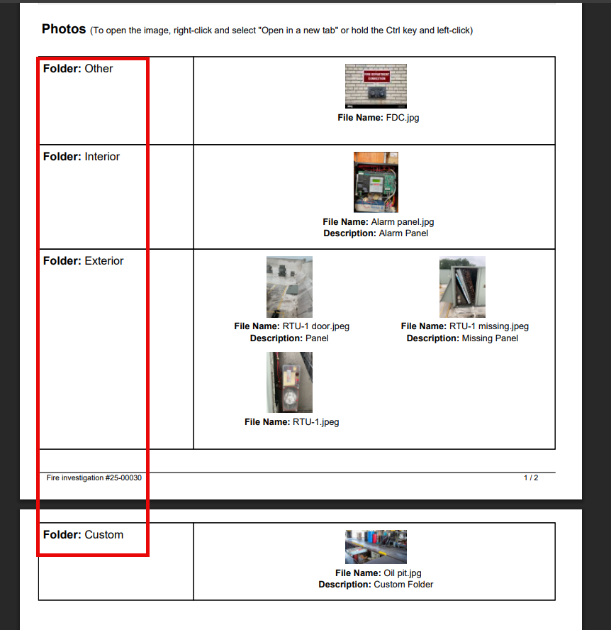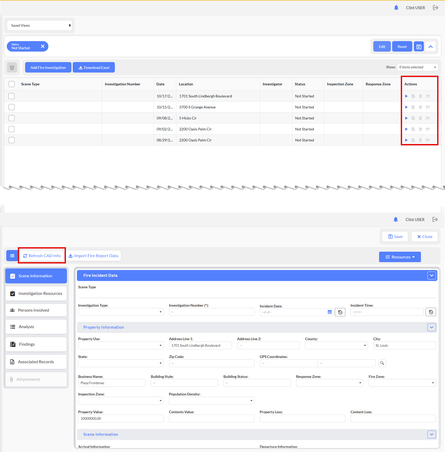 Fire Investigation Form Builder actions show the associated Form Builder ID