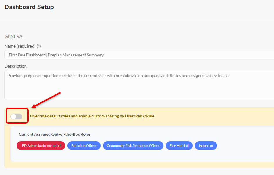 Users must belong to roles included in the dashboard’s assigned sharing settings (e.g., Company Officer, Fire Inspector, Finance Manager).