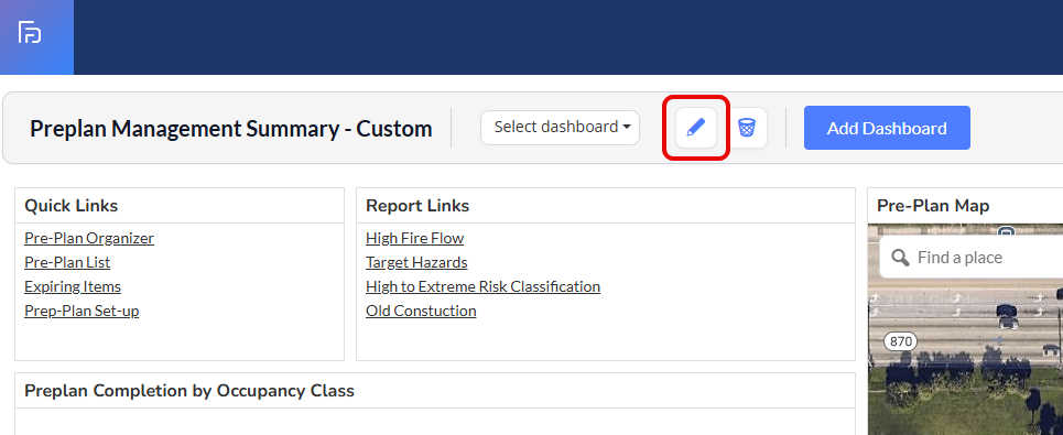 Pre-Plans Dashboard: provides a pre-plans overview, interactive map, and commonly requested planning reports.