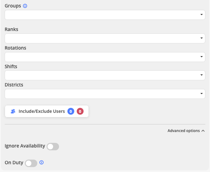 A: "Groups" refers to organizational groupings you've created in your system (such as specialized teams or administrative divisions), while "Shifts" refers to standard duty rotations (A-shift, B-shift, C-shift, etc.). Groups are typically used for cross-shift organizational structures, while Shifts target personnel on specific duty cycles.