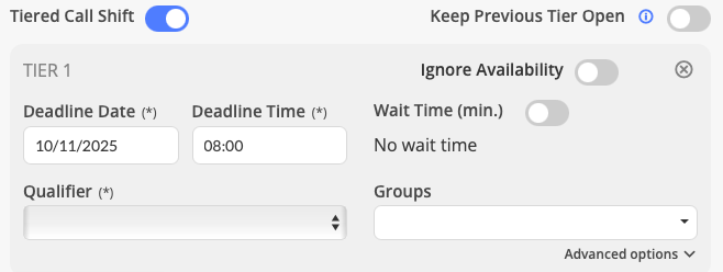 Q: What's the difference between tiered call shifts and just selecting multiple qualifiers? A: Tiered call shifts send notifications sequentially - the second tier only receives notifications if the first tier doesn't fill the position by the deadline. Selecting multiple qualifiers sends to everyone simultaneously.