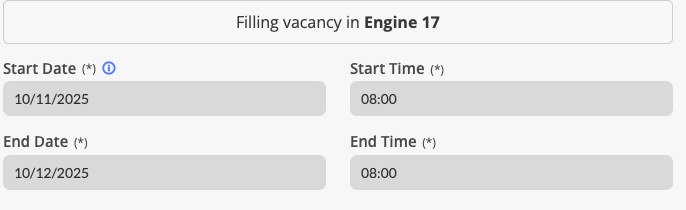 The system automatically populates the Start Date/Time and End Date/Time based on the selected vacancy. These fields are locked and cannot be modified. However, you can adjust the Deadline Date/Time for when personnel must respond to the call shift offer.