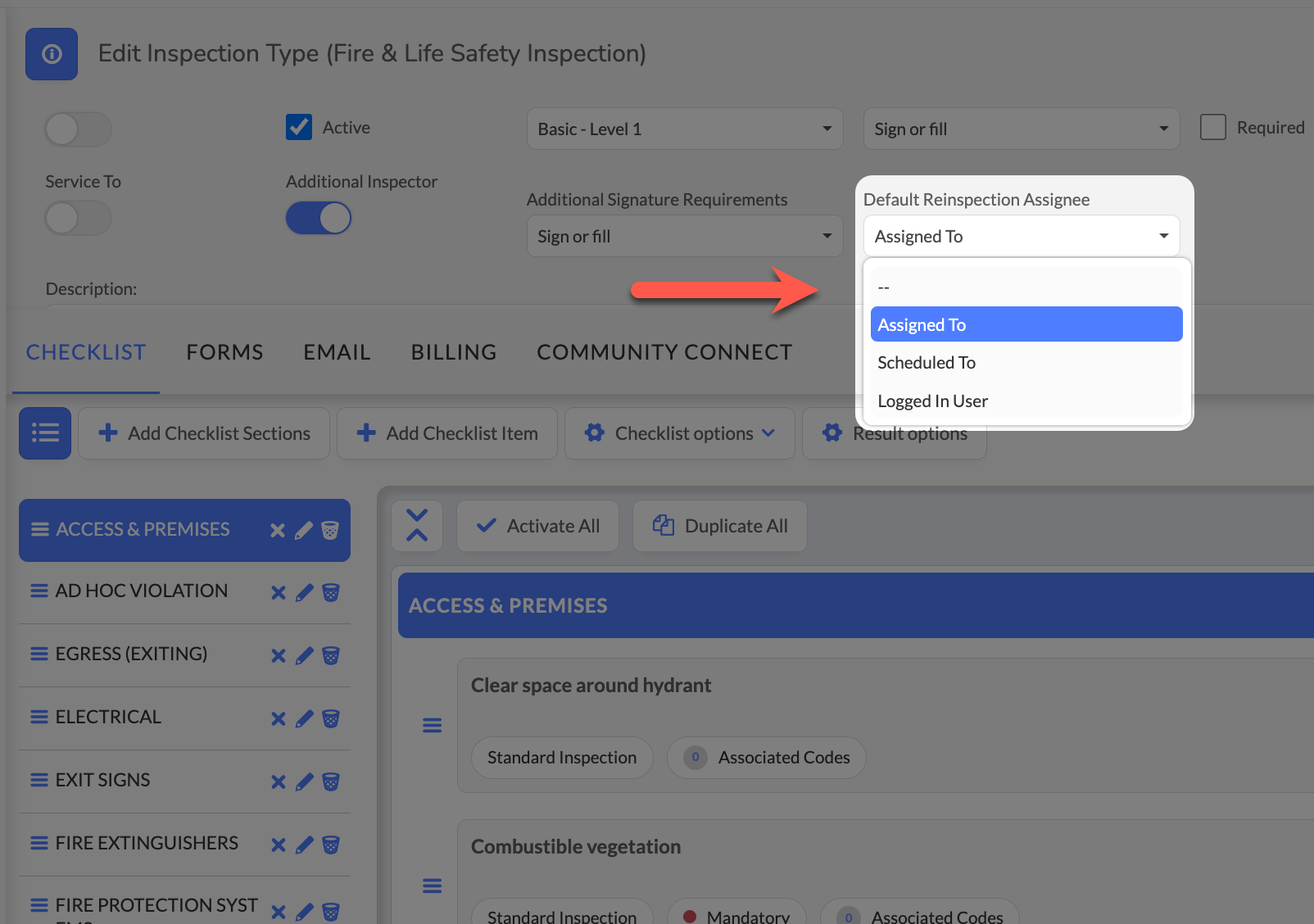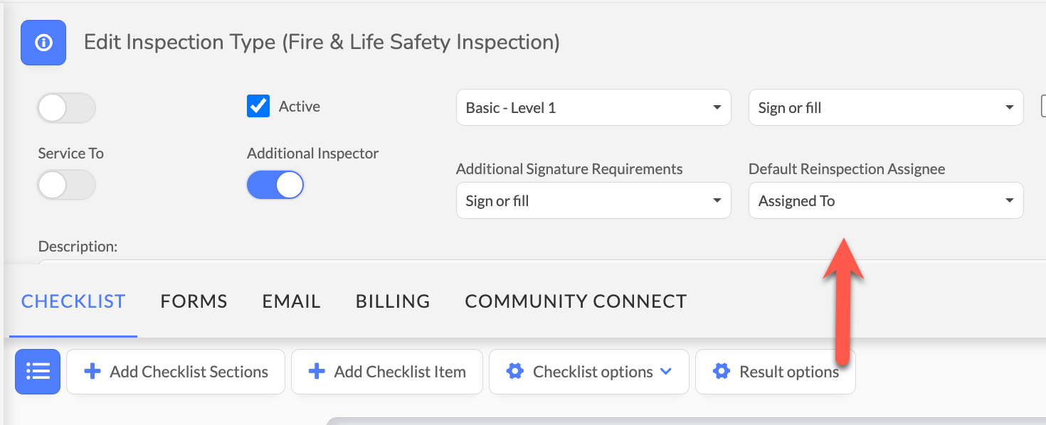 Configure Default Reinspection Assignee at the inspection type level to match different workflow needs (e.g., annual inspections vs. complaint-based inspections may need different strategies)