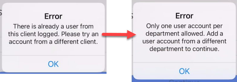 - Why: It is known that a device cannot be logged in as two different users from the same department. When this was attempted, the verbiage of the error was unclear and has been clarified.