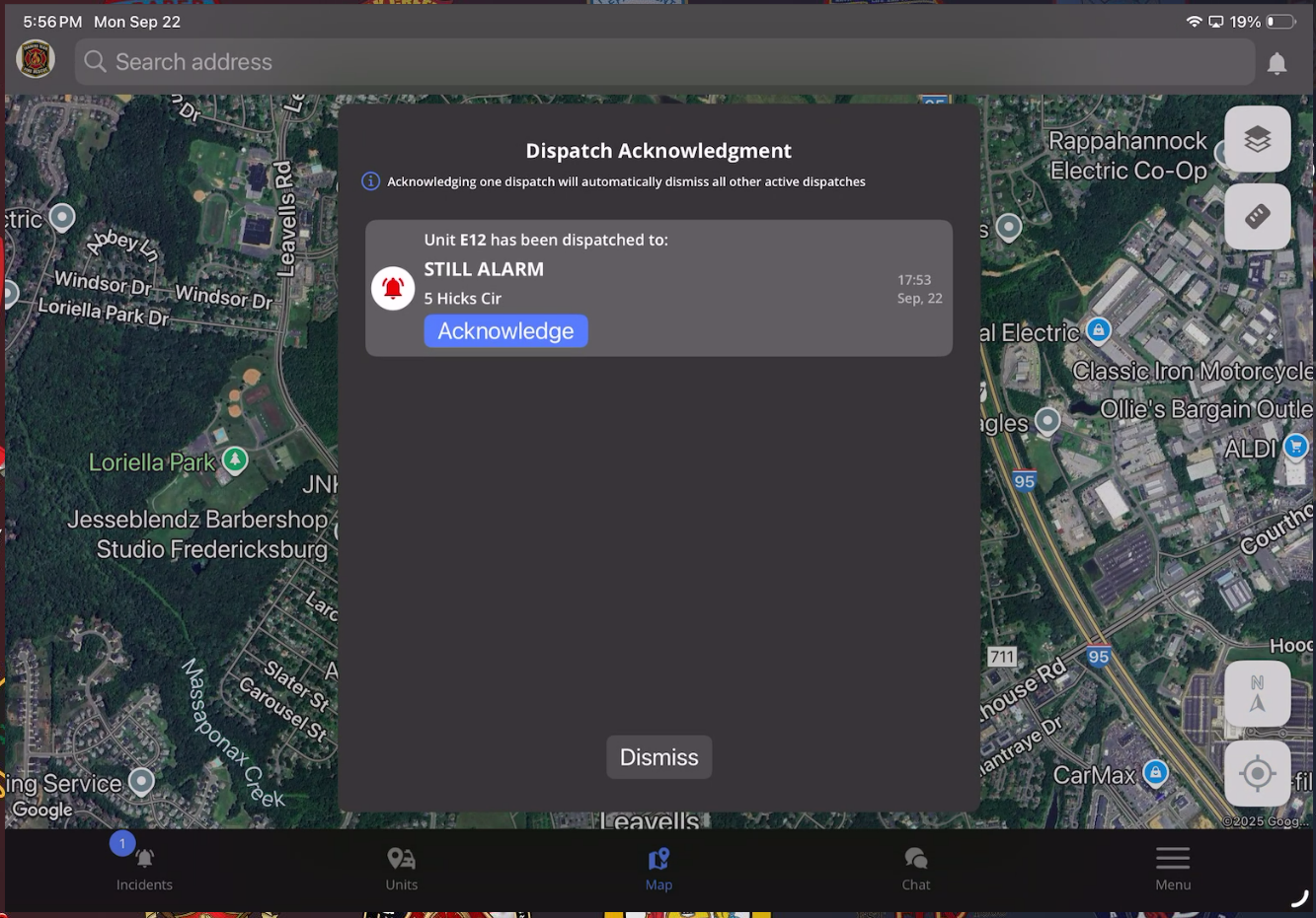 What: When a specified unit user is dispatched on an incident, a modal populates that must be acknowledged or dismissed prior to allowing any other activity on the app.