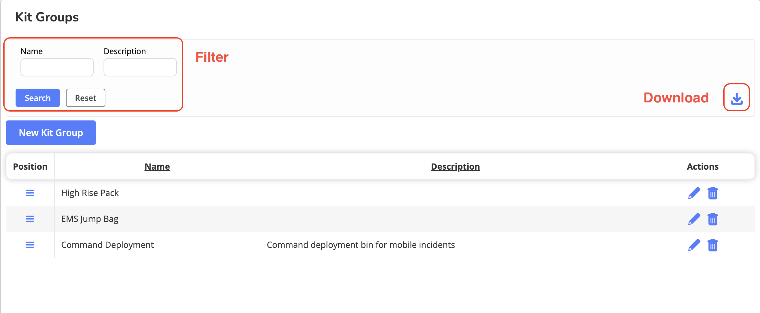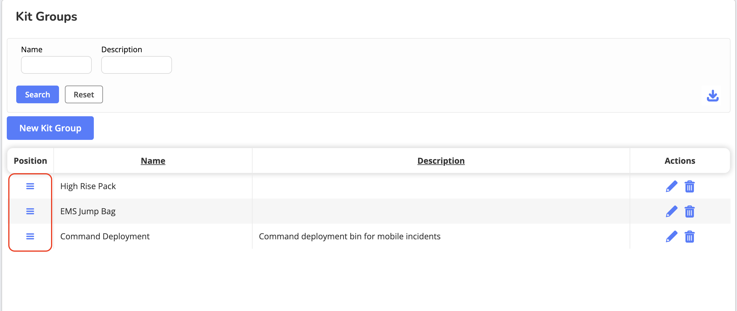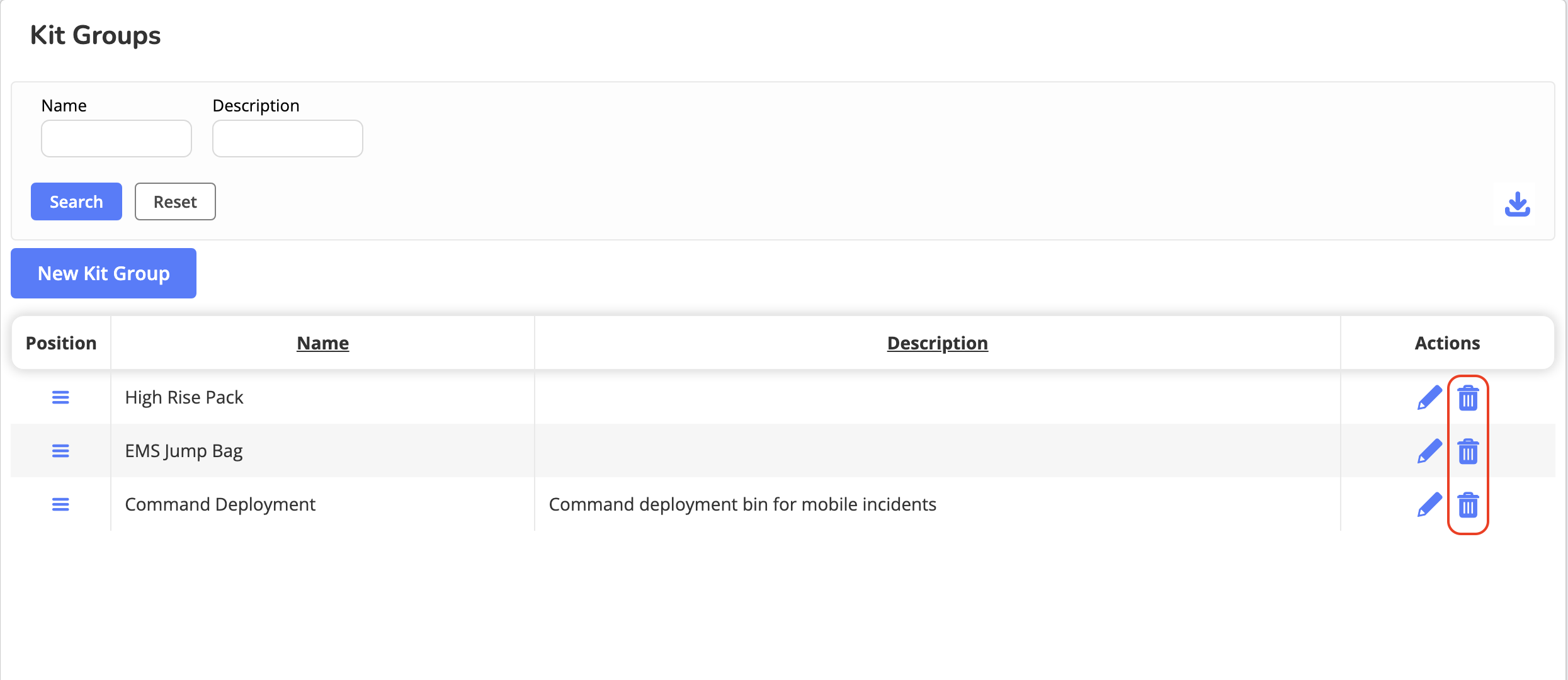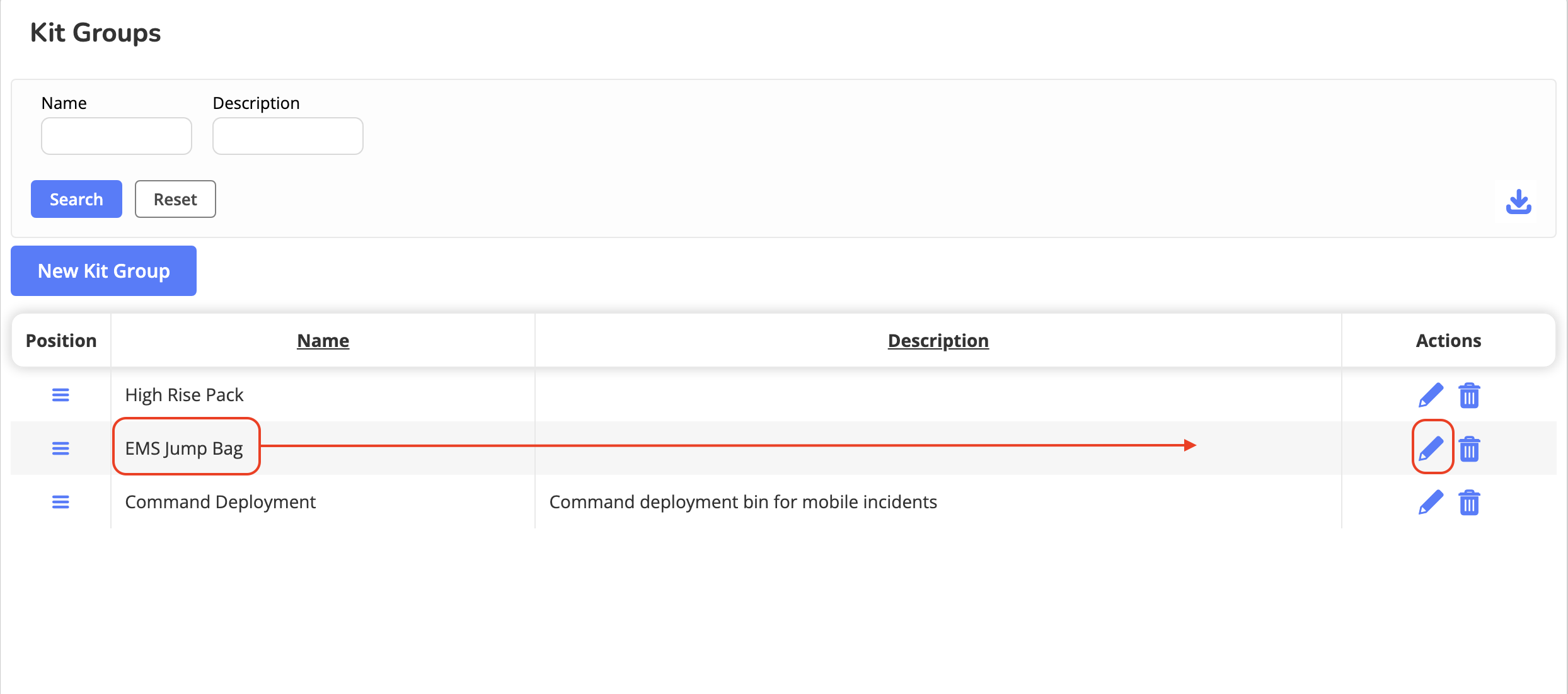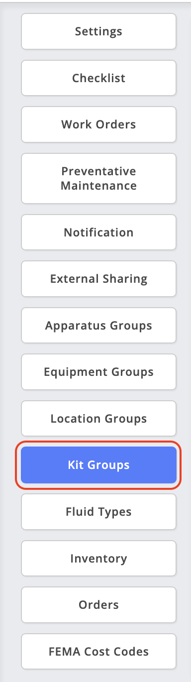 Kit Group management allows administrators to reorganize, edit, or delete existing kit groups to keep kit organization accurate across inspections, inventory, and reporting workflows.