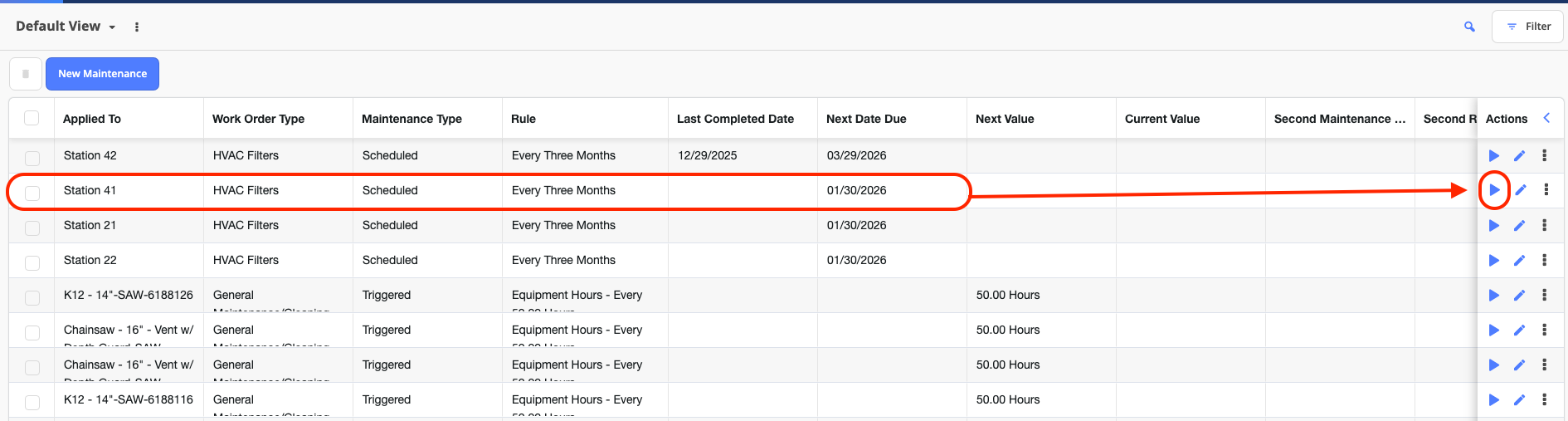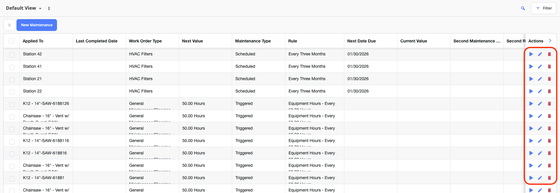 Adjust columns (drag and drop) as needed to surface relevant information such as trigger thresholds or last completed dates.