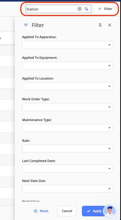 Use the available search and filter fields to narrow results by asset, PM type, or status.