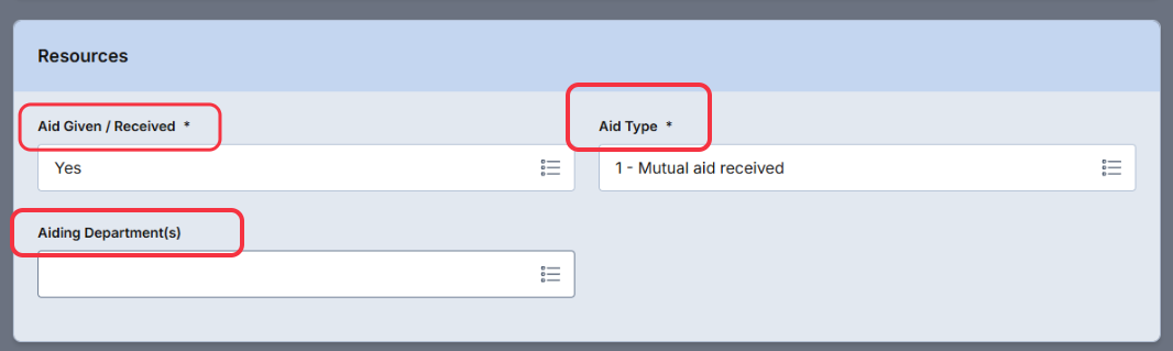 Fields marked with an asterisk (*) are required. Fields highlighted in green are highly recommended—they help establish connections between apparatus and aiding departments while identifying specific aid types.
