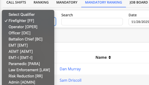 Mandatory ranking is a critical component of public safety scheduling that ensures adequate staffing levels during all operational periods. This feature addresses situations where voluntary shift coverage is insufficient and mandatory assignments become necessary. The system maintains ranked lists of qualified personnel for different specialties and positions, allowing fair and systematic assignment of mandatory duties. This tool is essential for maintaining operational readiness while distributing mandatory assignments equitably among qualified staff members.