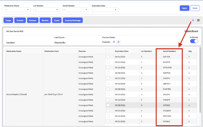Displaying serial numbers in a clear, predictable order makes it easier to review inventory, verify records, and quickly identify missing or out-of-sequence items, especially when managing large volumes of medications.