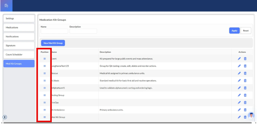 An administrator can rely on alphabetical ordering for quick setup or switch to a custom order that mirrors operational workflows, ensuring Med Kit Groups appear in the most logical sequence for daily use.