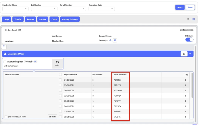 Medication serial numbers are now displayed in correct sequential order within each individual medication type. A new sorting approach ensures serial numbers appear in ascending, alphanumeric sequence, regardless of associated lot numbers or expiration dates, and remains consistent across all system views.