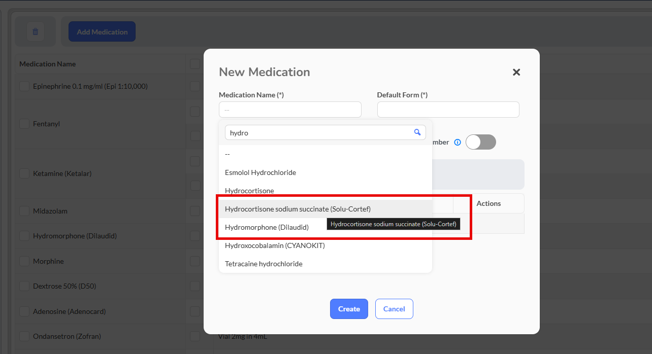 The medications list was updated to include additional medications and improve naming clarity for existing entries. Several new medications and forms were added, and select medications were relabeled for consistency and easier identification. Hydroxocobalamin was updated to display its common brand name as Hydroxocobalamin (CYANOKIT).