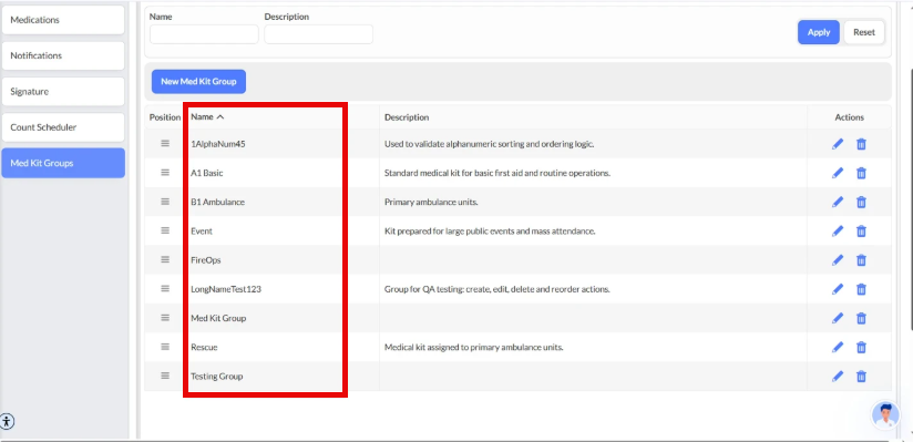 Med Kit Groups now support alphanumeric sorting and custom ordering. Groups are displayed alphabetically by default in Setup, with the option to switch to a manually defined order. This ordering is reflected consistently on the Med Kit page.