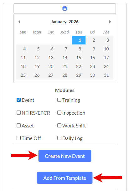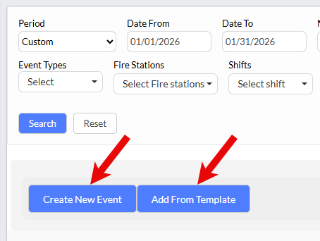 Q: I can create new events but don't see template options. Why might this be? A: Template options require specific permissions and depend on having templates configured in your system. If you don't see "Add from Template" options, you may lack "Add Event From Template" permission, or your department may not have event templates set up yet.