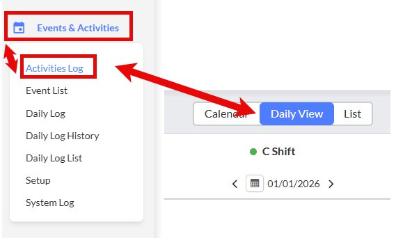Navigate to Events and Activities module → Activities Log then select the "Daily" view tab