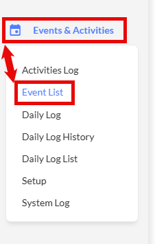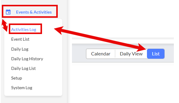 Navigate to Events and Activities module → Activities Log then select the "List" view tab