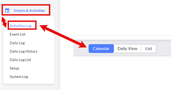 Navigate to Events and Activities module → Activities Log then select the "Calendar" view tab