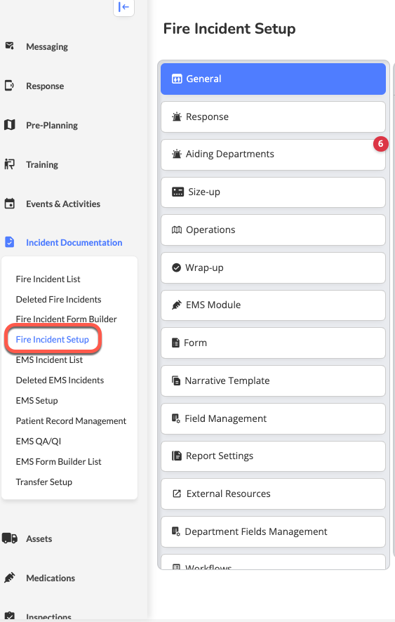 1. Navigate to Fire Incident Setup from the Incident Documentation Module.