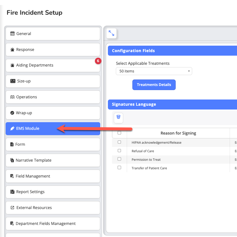 The Configuration Fields section of the Fire Incident EMS Module allows administrators to customize treatment and medication options to align with local protocols and operational standards. This feature enables departments to: