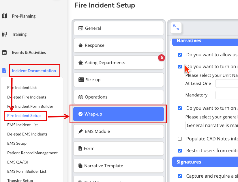 The Fire Incident Wrap-up setup allows administrators to configure narrative entry options and signature requirements for fire incident reports. This feature provides flexible control over how narratives are documented, who can contribute to them, and what requirements must be met before an incident report can be finalized. By properly configuring these settings, departments can ensure consistent documentation practices, maintain accountability, and streamline the incident reporting process while meeting documentation compliance requirements.