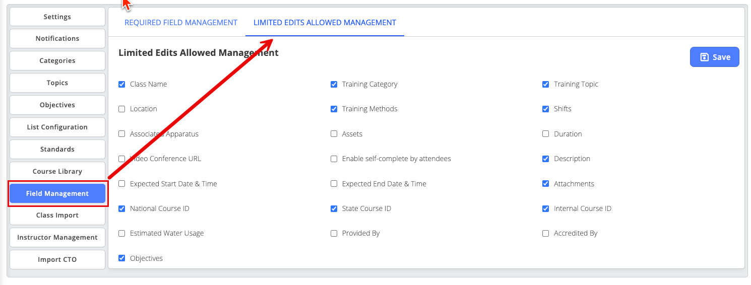 - How: Navigate to Training > Setup > Field Management > Limited Edits Allowed Management. Fields selected here are not allowed to be edited if during the Course creation process the Admin selects the "Limit Edits Allowed" toggle switch. Reminder: Ensure you select Save at the end to ensure selections have been captured