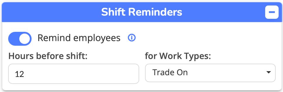 Toggle the Remind Employees setting to the "On" position. This activates the automated shift reminder functionality for your agency.