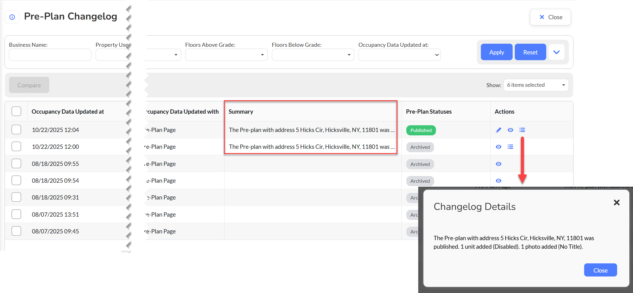 - How: Access from the Pre-Plan Organizer by clicking the History button (↻) next to any address. In the resulting screen, there is a column labeled Summary that the user can access information and also a "Bulleted List icon" in the Actions column that displays a pop-up with the summary of changes.