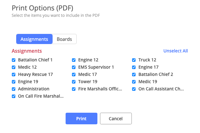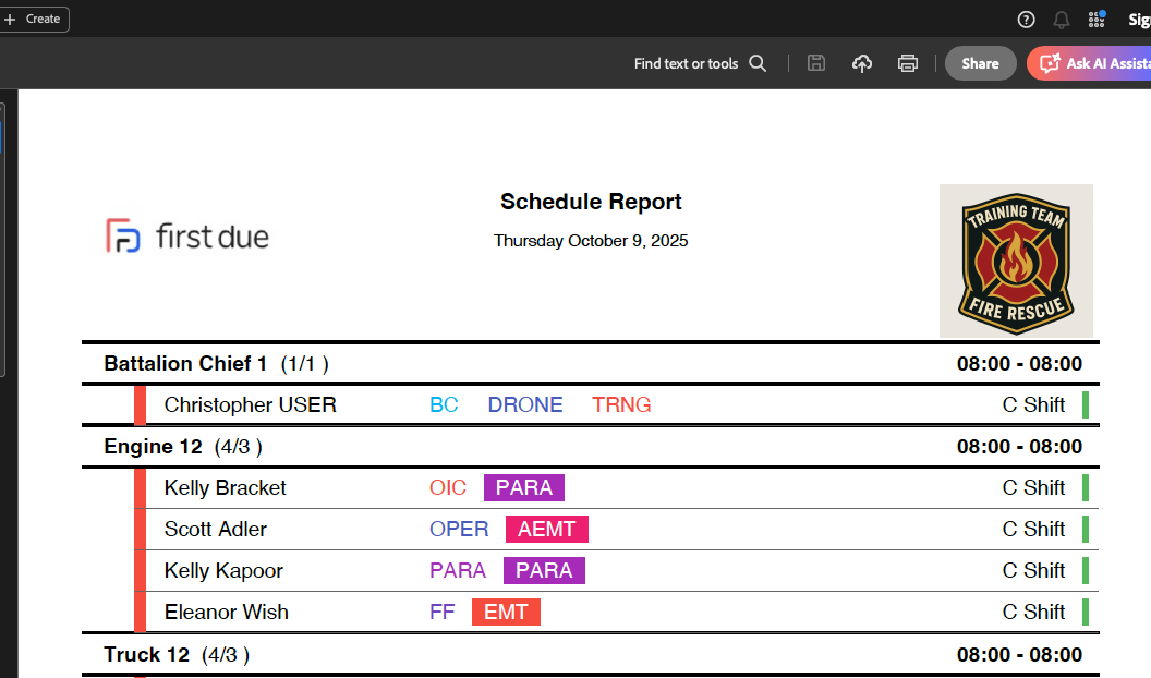 Q: Can I customize the information that appears on the printout beyond the available options? A: The print function offers preset customization options (Assignments/Boards, Time Off, Trades). For more extensive customization, consider using First Due's reporting features or contact support to discuss custom report development for your specific needs.